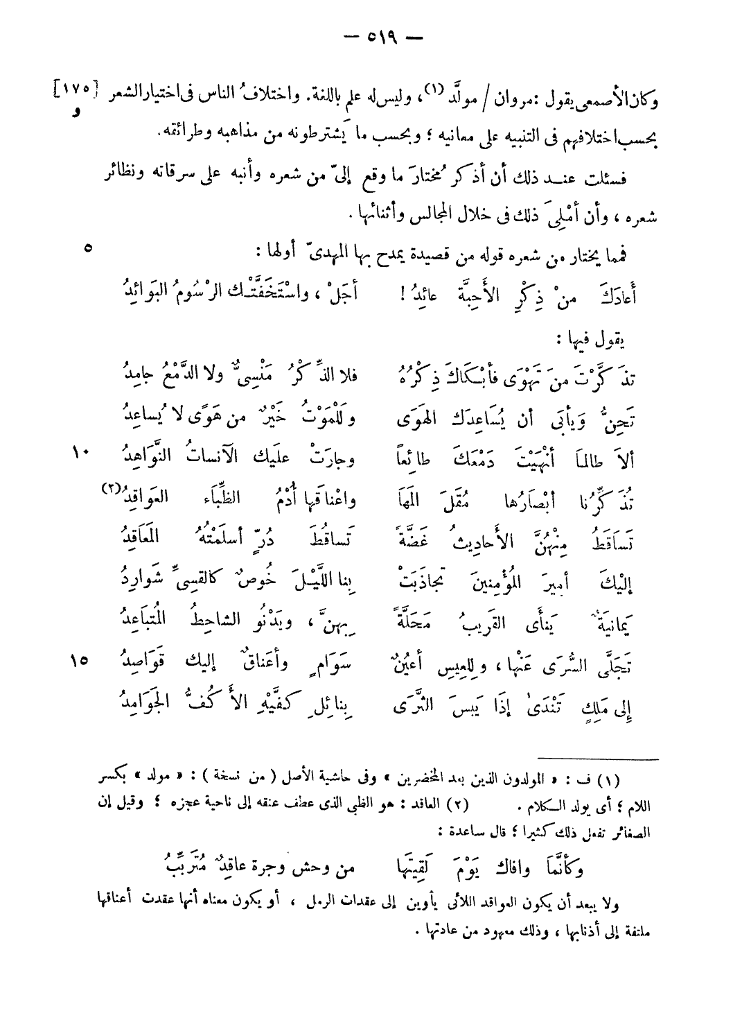 وكان الأصمعى يقول: مروان/ مولّد (¬1)، وليس له علم باللغة. واختلاف الناس فى اختيار الشعر بحسب اختلافهم فى التنبيه على معانيه؛ وبحسب ما يشترطونه من مذاهبه وطرائقه.