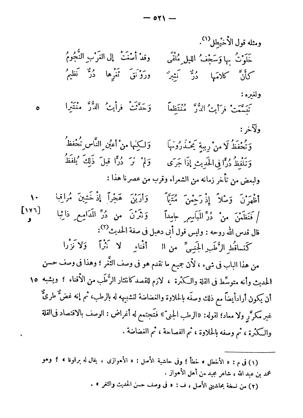 من هذا الباب فى شيء، لأن جميع ما تقدم هو فى وصف الثّغر؛ وهذا فى وصف حسن الحديث وأنه متوسّط فى القلة والكثرة، لازم للقصد كانتثار الرّطب من الأقناء؛ ويشبه أن يكون أراد أيضا مع ذلك وصفه بالحلاوة والغضاضة لتشبيهه له بالرطب، ثم إنه غضّ طرىّ غير مكرّر ولا معاد؛ لقوله: «الرطب الجنىّ» فتجتمع له أغراض: الوصف بالاقتصاد فى القلة والكثرة، ثم وصفه بالحلاوة، ثم الفصاحة، ثم الغضاضة.
