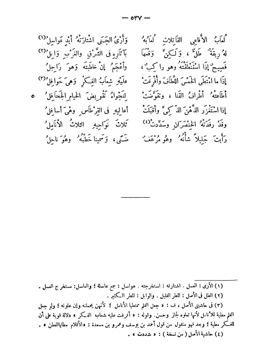 (¬3) فى حاشيتى الأصل، ف: «جعل القلم ممتطيا الأنامل؛ لأنهن يحملنه وإن علونه؛ ولو جعل القلم مطية للأنامل لأنها تعلوه لجاز وحسن. وقوله: «أفرغت عليه شعاب الفكر» دلالة قوية على أن للفكر مطية؛ وبعد فهو منقول من قول أحمد بن يوسف وعمرو بن مسعدة: «الأقلام مطايا الفطن».