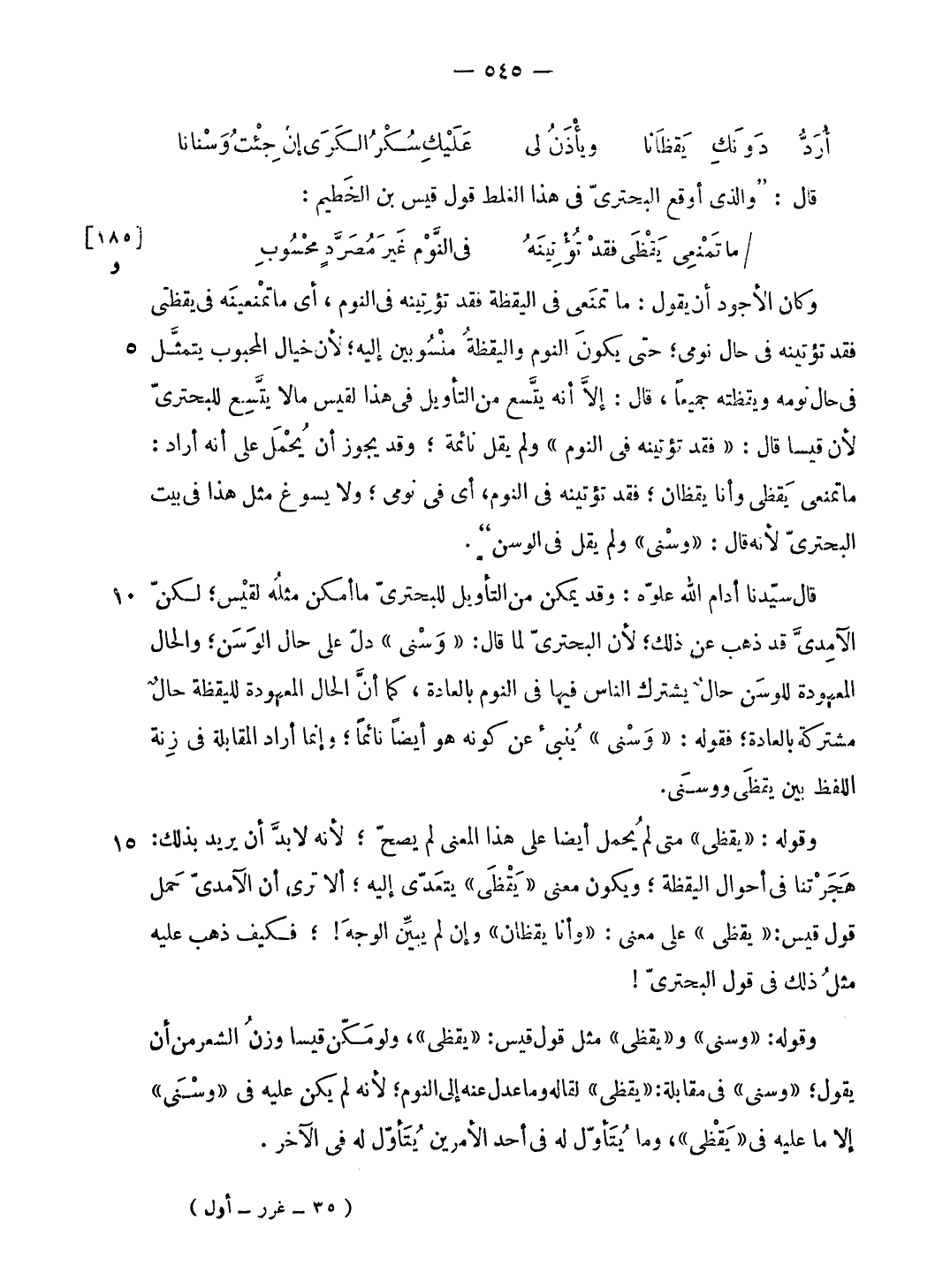 قال سيّدنا أدام الله علوّه: وقد يمكن من التأويل للبحترىّ ما أمكن مثله لقيس؛ لكنّ الآمدىّ قد ذهب عن ذلك؛ لأن البحترىّ لما قال: «وسنى» دلّ على حال الوسن؛ والحال المعهودة للوسن حال يشترك الناس فيها فى النوم بالعادة، كما أنّ الحال المعهودة لليقظة حال مشتركة بالعادة؛ فقوله: «وسنى» ينبئ عن كونه هو أيضا نائما؛ وإنما أراد المقابلة فى زنة اللفظ بين يقظى ووسنى.