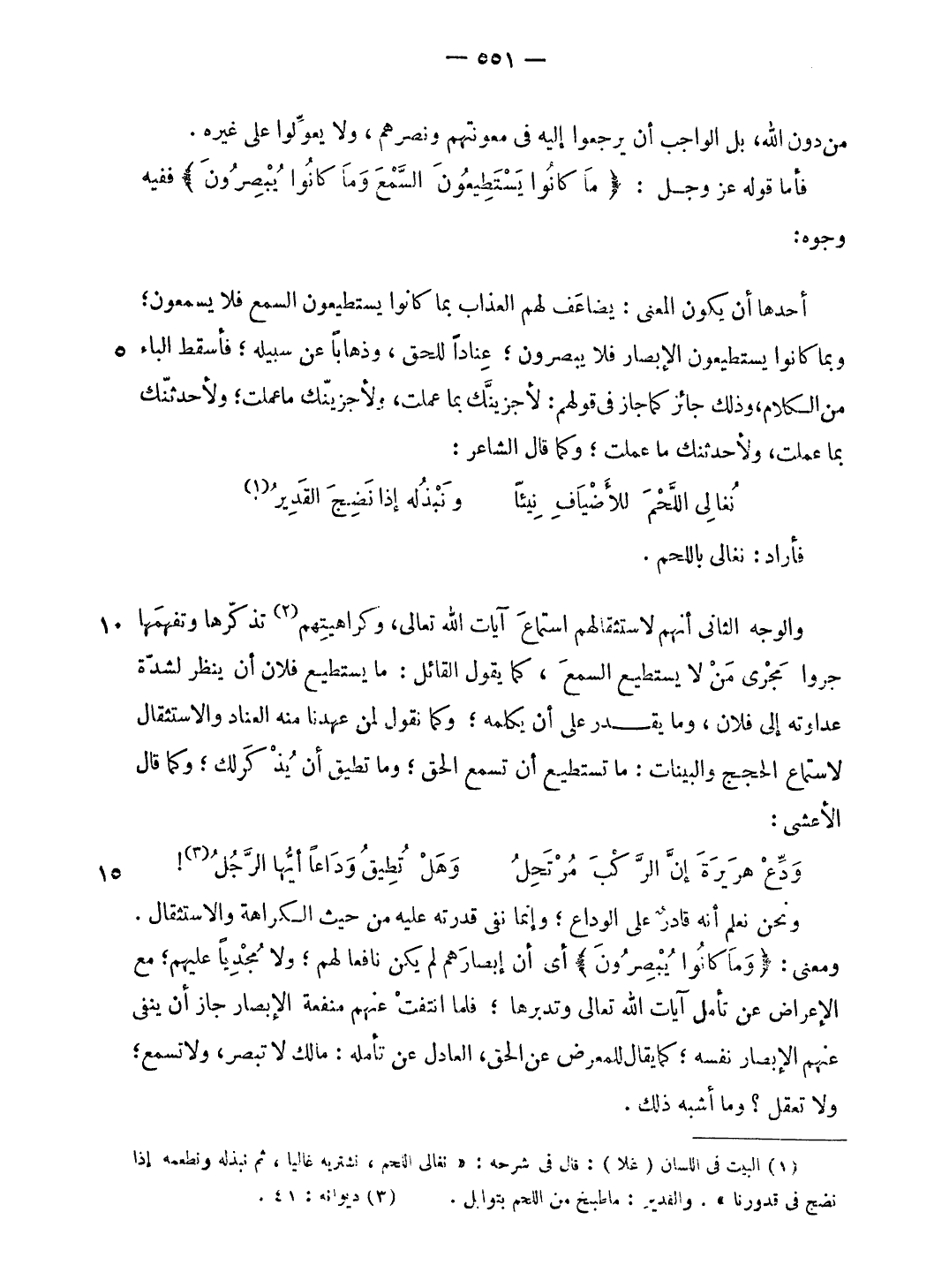 أحدها أن يكون المعنى: يضاعف لهم العذاب بما كانوا يستطيعون السمع فلا يسمعون؛ وبما كانوا يستطيعون الإبصار فلا يبصرون؛ عنادا للحق، وذهابا عن سبيله؛ فأسقط الباء من الكلام، وذلك جائز كما جاز فى قولهم: لأجزينّك بما عملت، ولأجزينّك ما عملت؛ ولأحدثنّك بما عملت، ولأحدثنك ما عملت؛ وكما قال الشاعر: