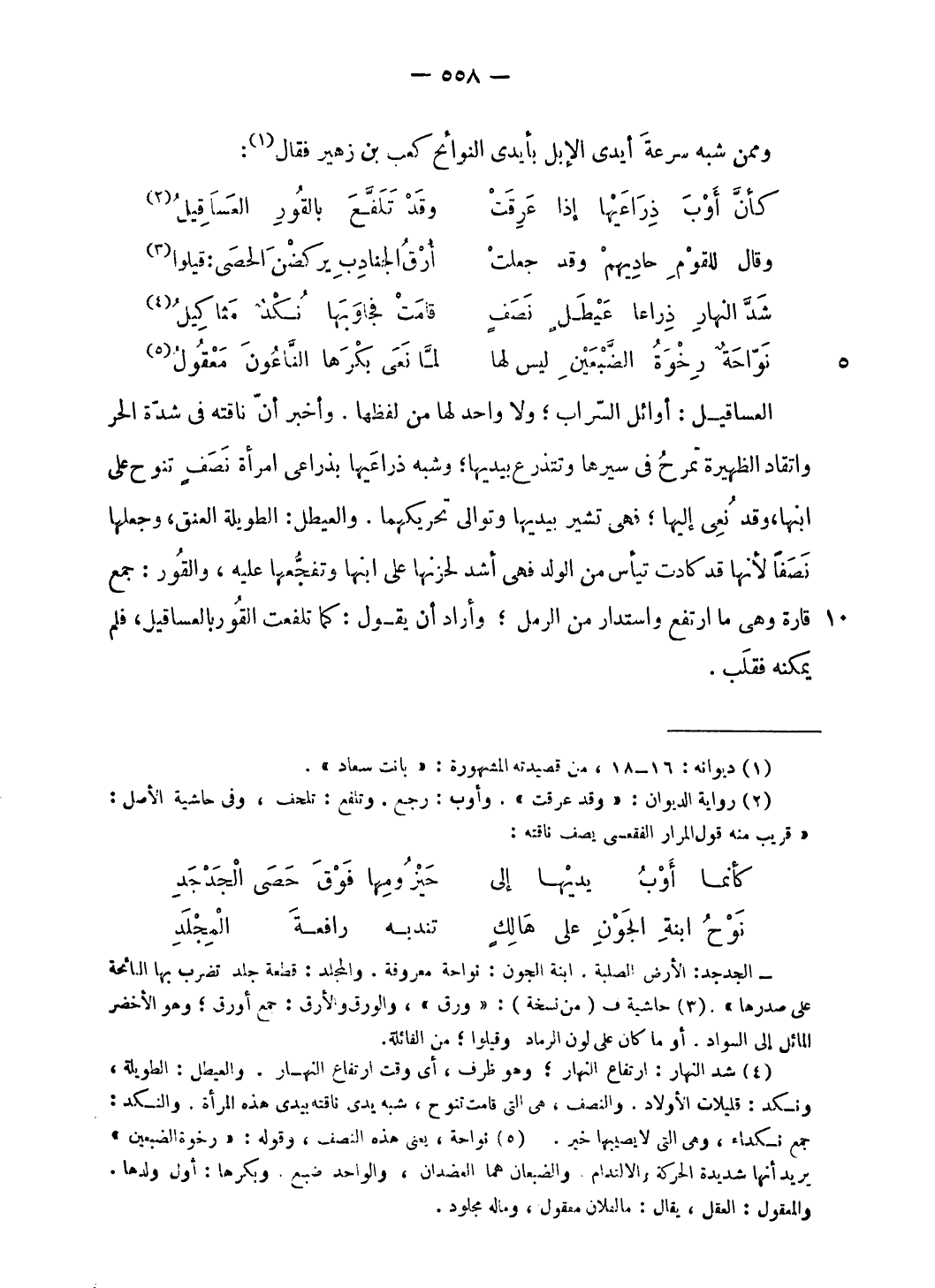 (¬4) شد النهار: ارتفاع النهار؛ وهو ظرف، أى وقت ارتفاع النهار. والعيطل: الطويلة، ونكد: قليلات الأولاد. والنصف، هى التى قامت تنوح، شبه يدى ناقته بيدى هذه المرأة. والنكد: