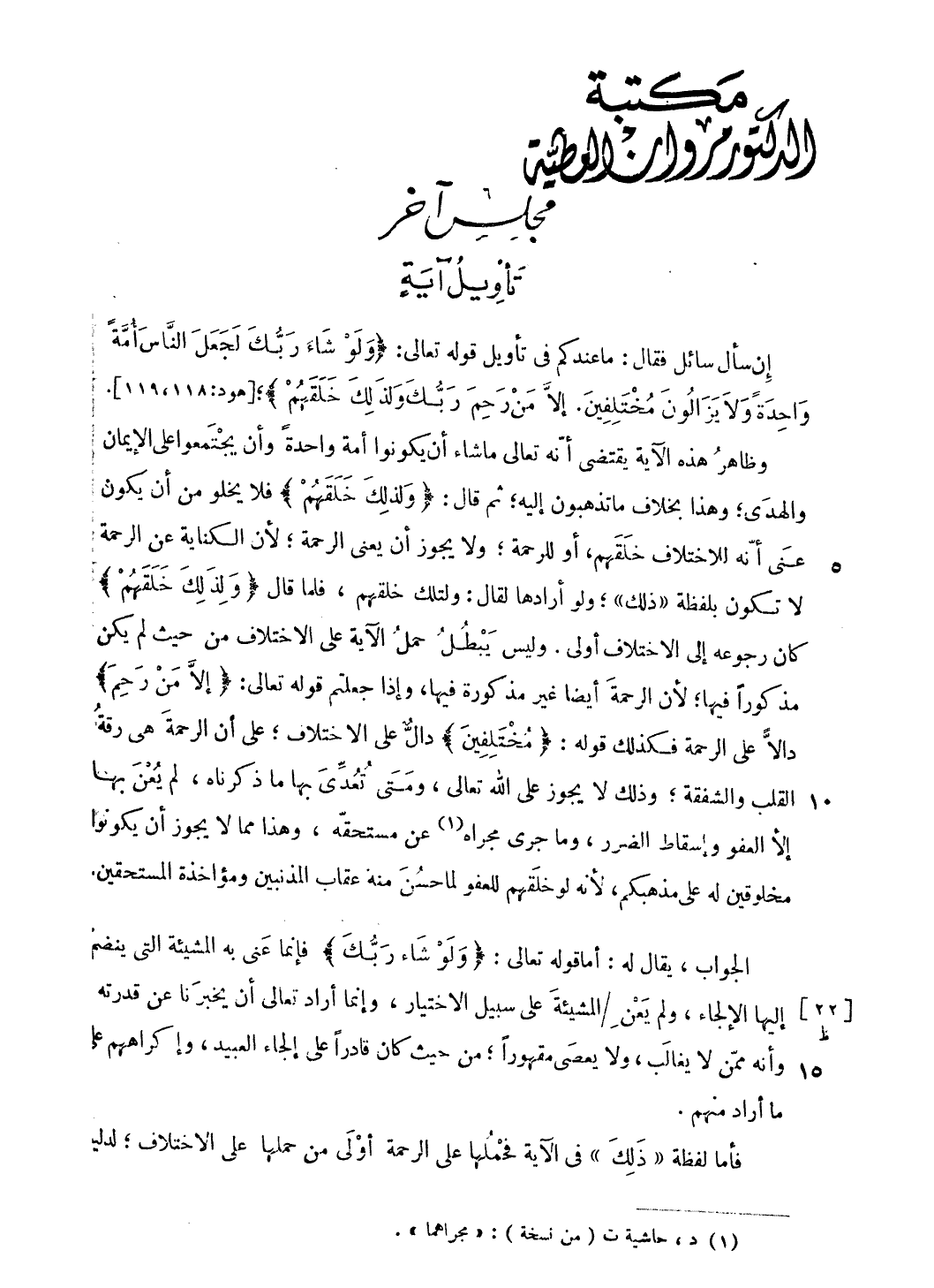 إن سأل سائل فقال: ما عندكم فى تأويل قوله تعالى: وَلَوْ شاءَ رَبُّكَ لَجَعَلَ النَّاسَ أُمَّةً واحِدَةً وَلا يَزالُونَ مُخْتَلِفِينَ. إِلَّا مَنْ رَحِمَ رَبُّكَ وَلِذلِكَ خَلَقَهُمْ؛ [هود: 118، 119].