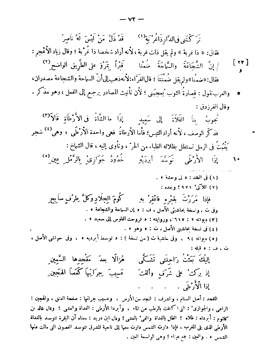 فذكّر الوصف، لأنه أراد التيس؛ فأما الأرطاة فهى واحدة الأرطى، وهى (¬4) شجر ينبت فى الرمل تستظل بظلاله الظباء من الحرّ، وتأوى إليه، قال الشماخ: