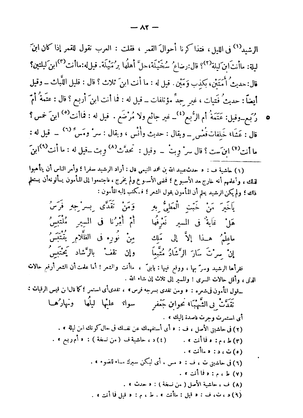 الرشيد (¬1) فى الليل، فتذاكرنا أحوال القمر، فقلت: العرب تقول للقمر إذا كان ابن ليلة: ما أنت ابن ليلة (¬2)؟ قال: رضاع سخيلة، حلّ أهلها برميلة. قيل له: ما أنت (¬3) ابن ليلتين؟