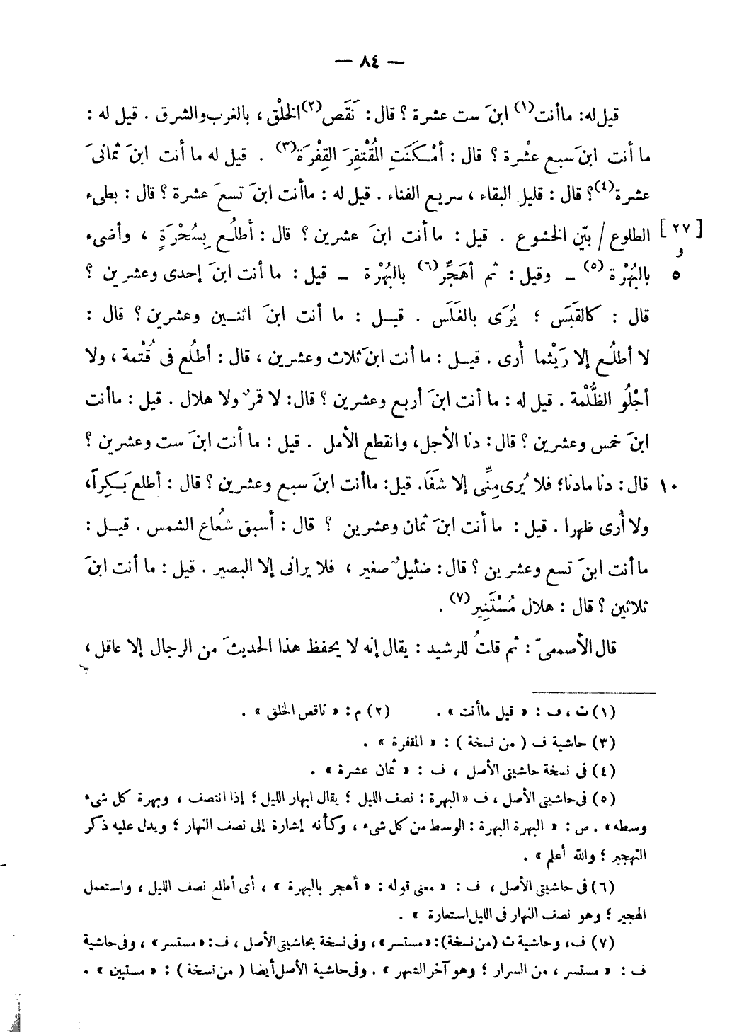 قال: دنا ما دنا؛ فلا يرى منّى إلا شفا. قيل: ما أنت ابن سبع وعشرين؟ قال: أطلع بكرا، ولا أرى ظهرا. قيل: ما أنت ابن ثمان وعشرين؟ قال: أسبق شعاع الشمس. قيل:
