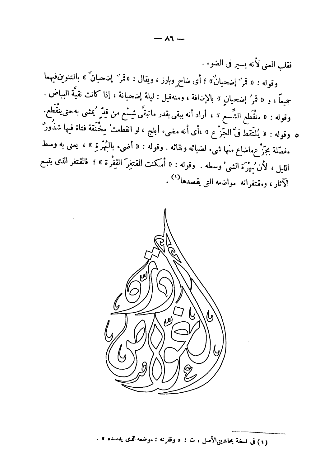 وقوله: «يلتقط فىّ الجزع»، أى أنه مضئ أبلج، لو انقطعت مخنقة فتاة فيها شذور مفصّلة بجزع ما ضاع منها شيء لضيائه ونقائه. وقوله: «أضيء بالبهرة»، يعنى به وسط الليل، لأن بهرة الشيء وسطه. وقوله: «أمكنت المقتفر القفرة»؛ فالمقتفر الّذي يتبع الآثار، ومقتفراته مواضعه التى يقصدها (¬1).