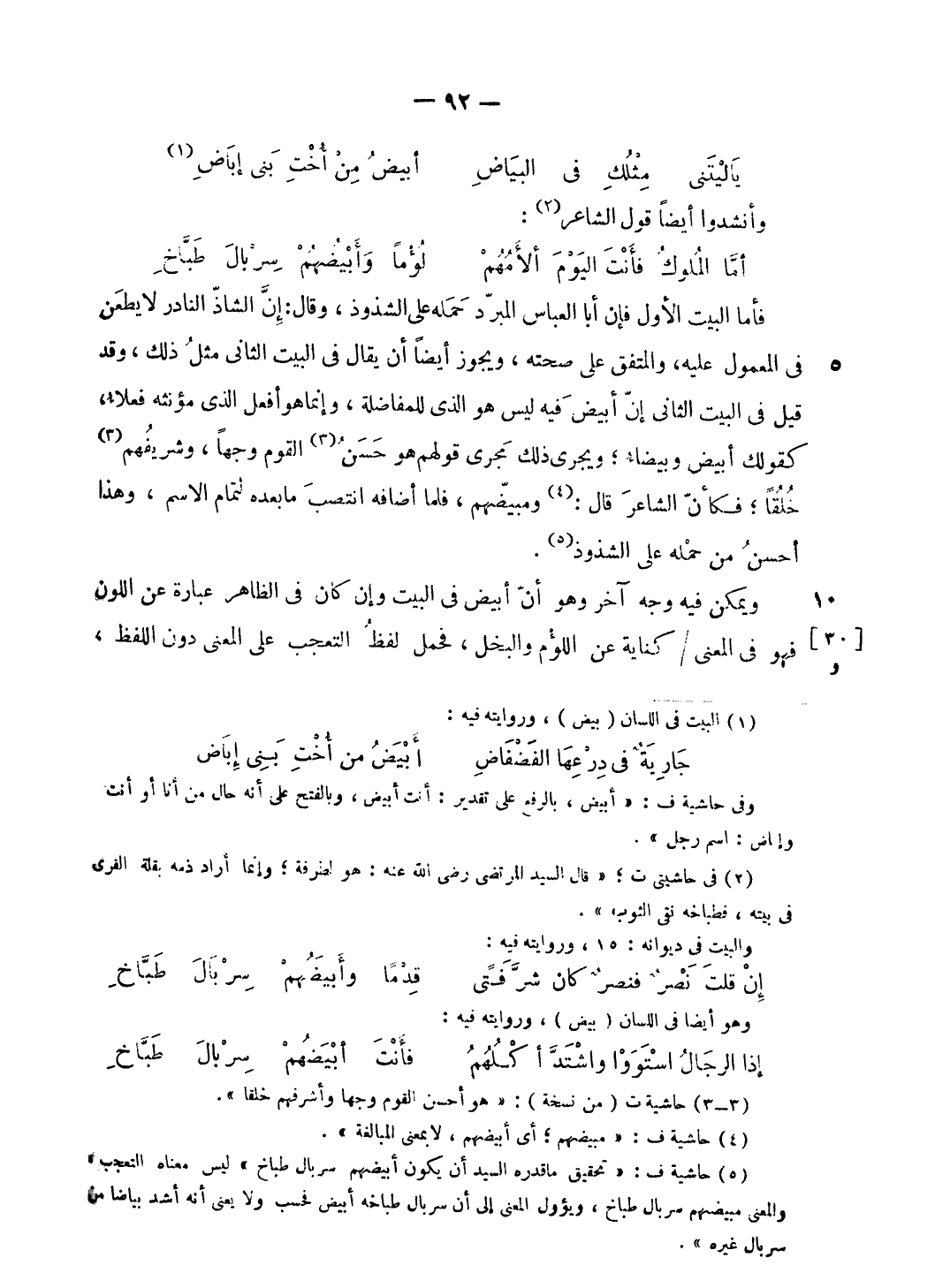 (¬5) حاشية ف: «تحقيق ما قدره السيد أن يكون أبيضهم سربال طباخ» ليس معناه التعجب، والمعنى مبيضهم سربال طباخ، ويؤول المعنى إلى أن سربال طباخه أبيض فحسب ولا يعنى أنه أشد بياضا من سربال غيره».