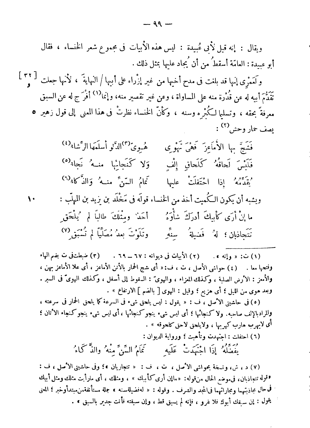 (¬5) فى حاشيتى الأصل، ف: «يقول: ليس يلحق شيء فى السرعة كما يلحق الحمار فى سرعته، والمراد بالإلف صاحبه. ولا كنجائها؛ أى ليس شيء ينجو كنجائها، أى ليس شيء ينجو كنجاء الأتان؛ أى لا يهرب هارب كهربها، ولا يلحق لاحق كلحوقه».