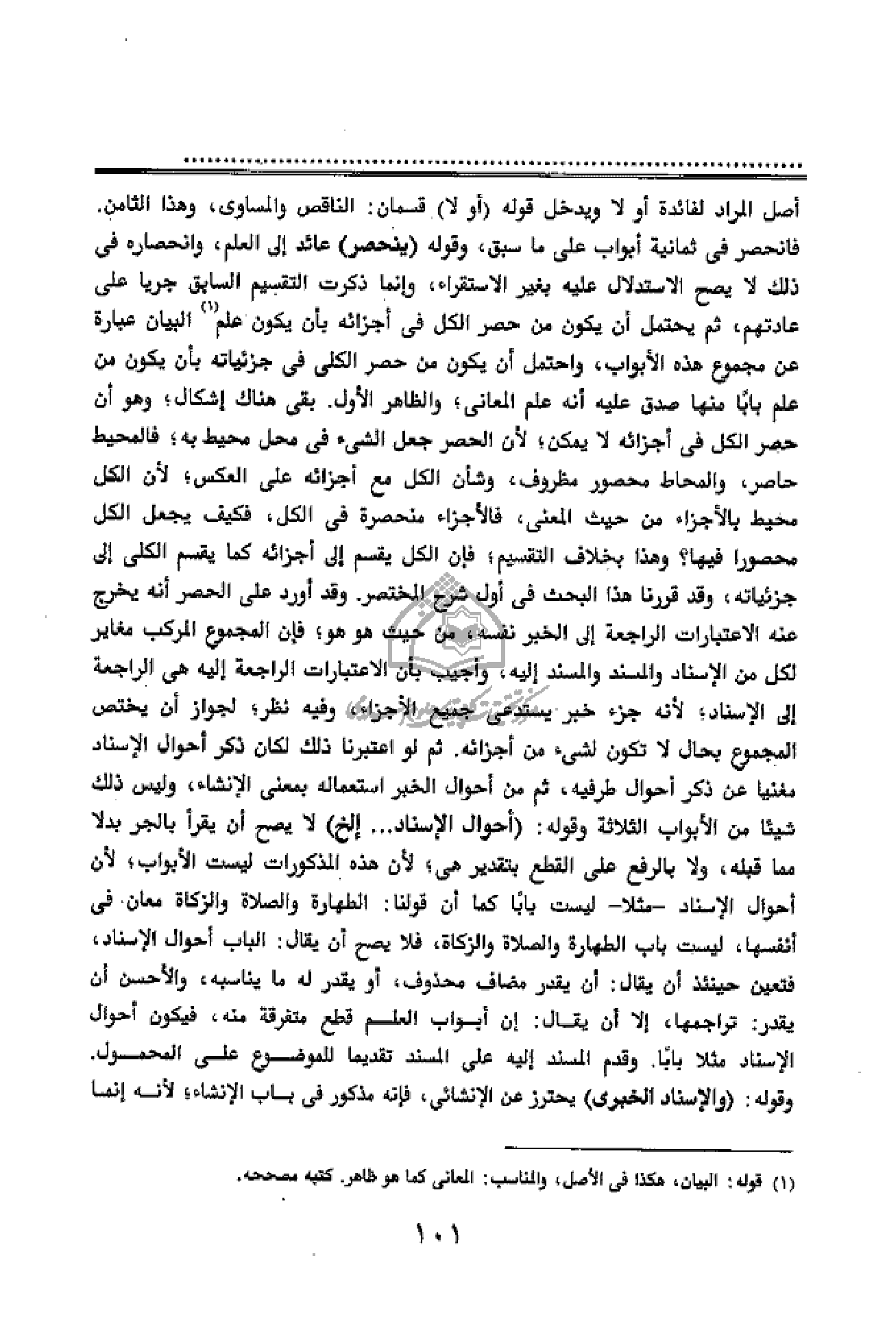 عليه بغير الاستقراء، وإنما ذكرت التقسيم السابق جريا على عادتهم، ثم يحتمل أن يكون من حصر الكل فى أجزائه بأن يكون علم (¬1) البيان عبارة عن مجموع هذه الأبواب، واحتمل أن يكون من حصر الكلى فى جزئياته بأن يكون من علم بابا منها صدق عليه أنه علم المعانى؛ والظاهر الأول. بقى هناك إشكال؛ وهو أن حصر الكل فى أجزائه لا يمكن؛ لأن الحصر جعل الشئ فى محل محيط به؛ فالمحيط حاصر، والمحاط محصور مظروف، وشأن الكل مع أجزائه على العكس؛ لأن الكل محيط بالأجزاء من حيث المعنى، فالأجزاء منحصرة فى الكل، فكيف يجعل الكل محصورا فيها؟ وهذا بخلاف التقسيم؛ فإن الكل يقسم إلى أجزائه كما يقسم الكلى إلى جزئياته، وقد قررنا هذا البحث فى أول شرح المختصر. وقد أورد على الحصر أنه يخرج عنه الاعتبارات الراجعة إلى الخبر نفسه، من حيث هو هو؛ فإن المجموع المركب مغاير لكل من الإسناد والمسند والمسند إليه، وأجيب بأن الاعتبارات الراجعة إليه هى الراجعة إلى الإسناد؛ لأنه جزء خبر يستدعى جميع الأجزاء، وفيه نظر؛ لجواز أن يختص المجموع بحال لا تكون لشئ من أجزائه. ثم لو اعتبرنا ذلك لكان ذكر أحوال الإسناد مغنيا عن ذكر أحوال طرفيه، ثم من أحوال الخبر استعماله بمعنى الإنشاء، وليس ذلك شيئا من الأبواب الثلاثة وقوله: (أحوال الإسناد ... إلخ) لا يصح أن يقرأ بالجر بدلا مما قبله، ولا بالرفع على القطع بتقدير هى؛ لأن هذه المذكورات ليست الأبواب؛ لأن أحوال الإسناد - مثلا - ليست بابا كما أن قولنا: الطهارة والصلاة والزكاة معان فى أنفسها، ليست باب الطهارة والصلاة والزكاة، فلا يصح أن يقال: الباب أحوال الإسناد، فتعين حينئذ أن يقال: أن يقدر مضاف محذوف، أو يقدر له ما يناسبه، والأحسن أن يقدر: تراجمها، إلا أن يقال: إن أبواب العلم قطع متفرقة منه، فيكون أحوال الإسناد مثلا بابا. وقدم المسند إليه على المسند تقديما للموضوع على المحمول.