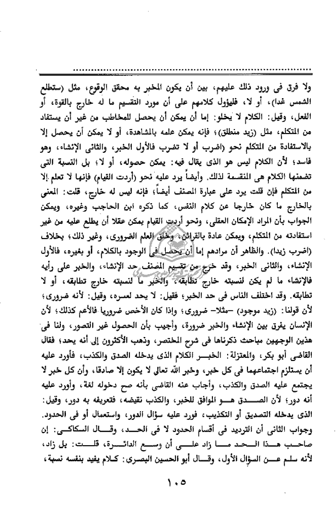 وجواب الثانى أن الترديد فى أقسام الحدود لا فى الحد، وقال السكاكى: إن صاحب هذا الحد ما زاد على أن وسع الدائرة، قلت: بل زاد، لأنه سلم عن السؤال الأول، وقال أبو الحسين البصرى: كلام يفيد بنفسه نسبة،