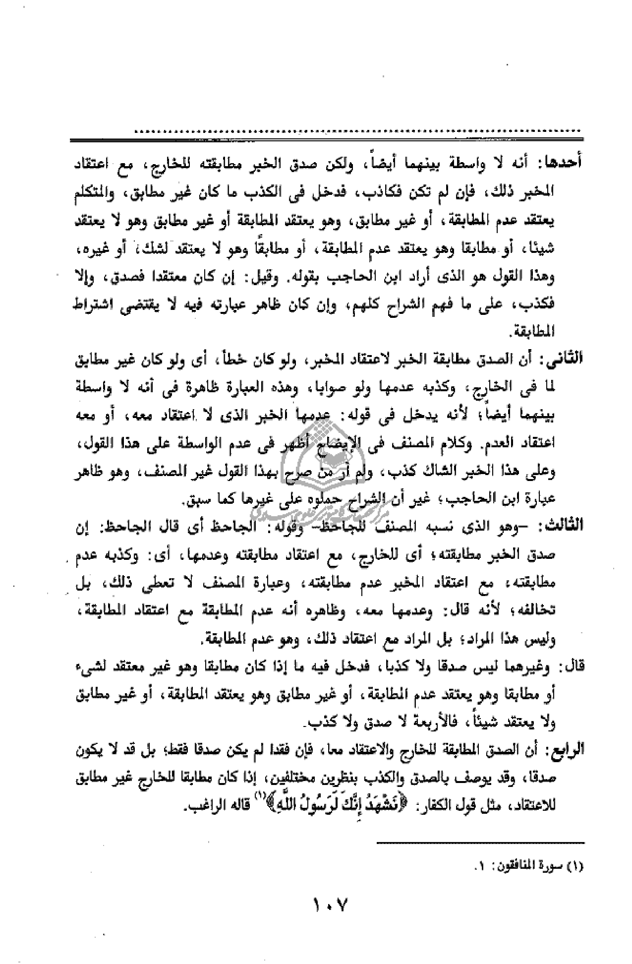 أحدها: أنه لا واسطة بينهما أيضا، ولكن صدق الخبر مطابقته للخارج، مع اعتقاد المخبر ذلك، فإن لم تكن فكاذب، فدخل فى الكذب ما كان غير مطابق، والمتكلم يعتقد عدم المطابقة، أو غير مطابق، وهو يعتقد المطابقة أو غير مطابق وهو لا يعتقد شيئا، أو مطابقا وهو يعتقد عدم المطابقة، أو مطابقا وهو لا يعتقد لشك، أو غيره، وهذا القول هو الذى أراد ابن الحاجب بقوله. وقيل: إن كان معتقدا فصدق، وإلا فكذب، على ما فهم الشراح كلهم، وإن كان ظاهر عبارته فيه لا يقتضى اشتراط المطابقة.