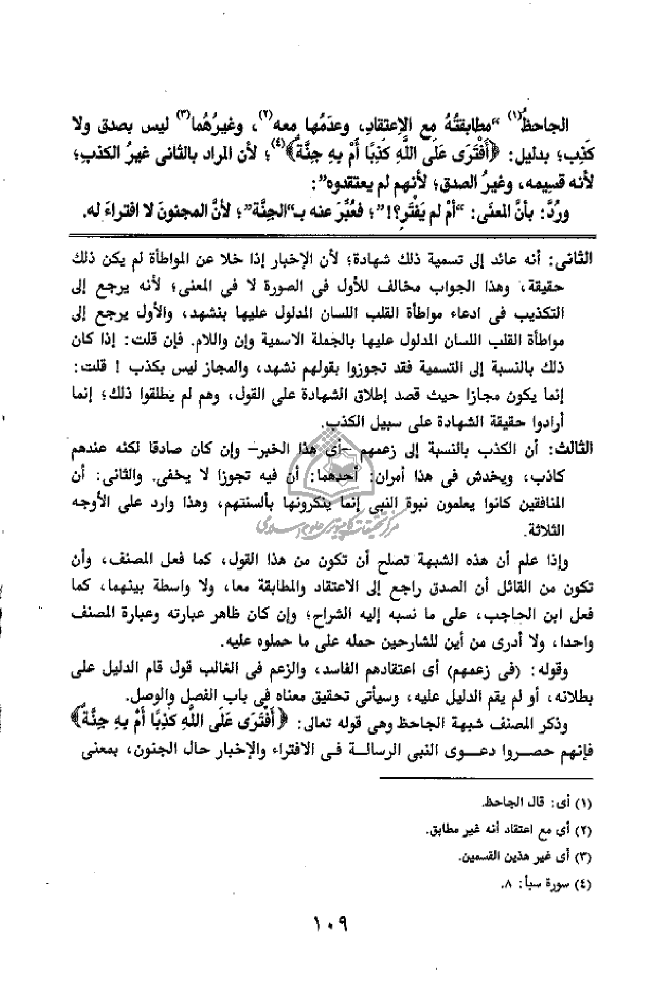 وذكر المصنف شبهة الجاحظ وهى قوله تعالى: أَفْتَرى عَلَى اللَّهِ كَذِباً أَمْ بِهِ جِنَّةٌ فإنهم حصروا دعوى النبى الرسالة فى الافتراء والإخبار حال الجنون، بمعنى