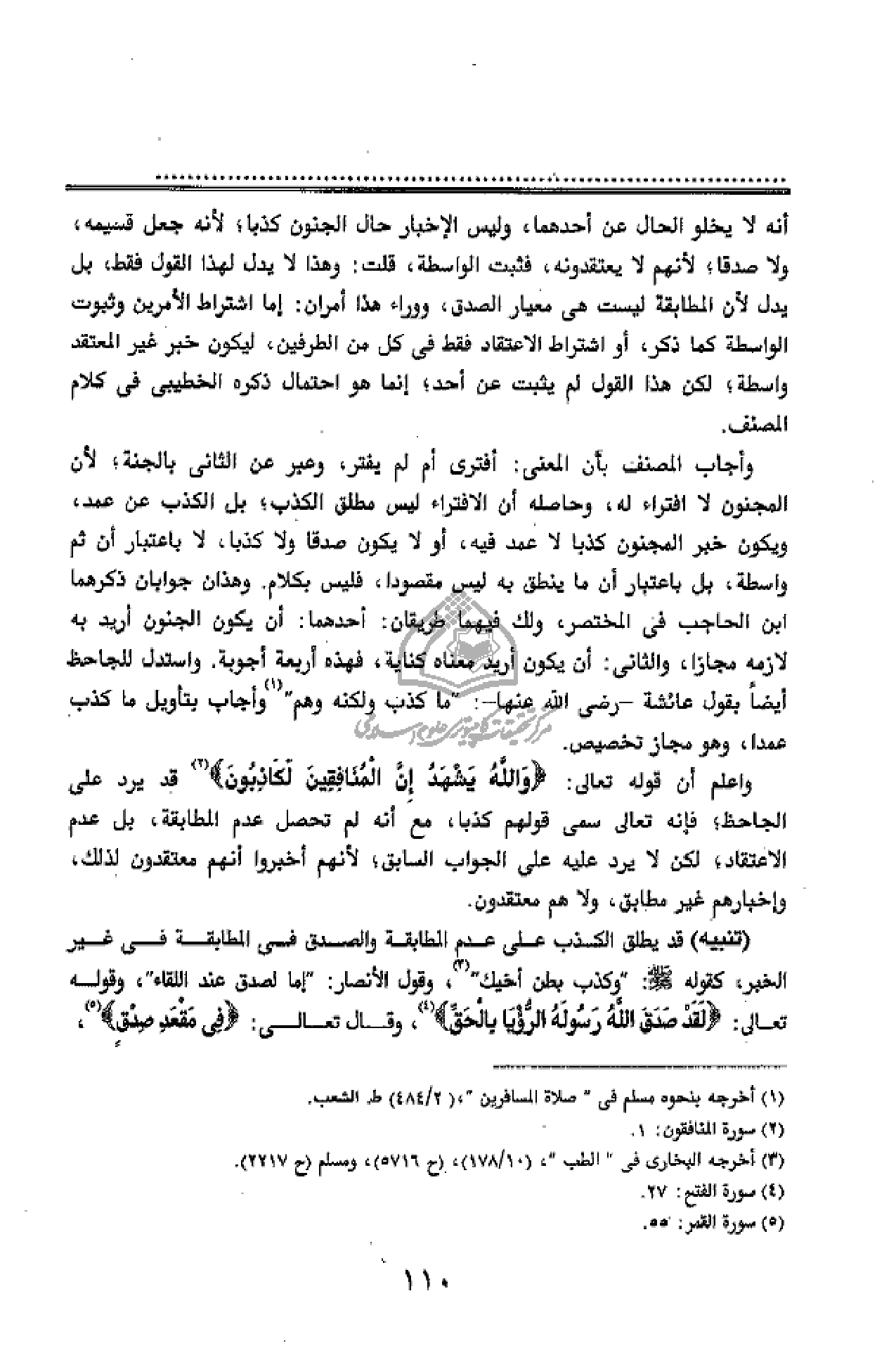 واعلم أن قوله تعالى: وَاللَّهُ يَشْهَدُ إِنَّ الْمُنافِقِينَ لَكاذِبُونَ (¬2) قد يرد على الجاحظ؛ فإنه تعالى سمى قولهم كذبا، مع أنه لم تحصل عدم المطابقة، بل عدم الاعتقاد؛ لكن لا يرد عليه على الجواب السابق؛ لأنهم أخبروا أنهم معتقدون لذلك، وإخبارهم غير مطابق، ولا هم معتقدون.