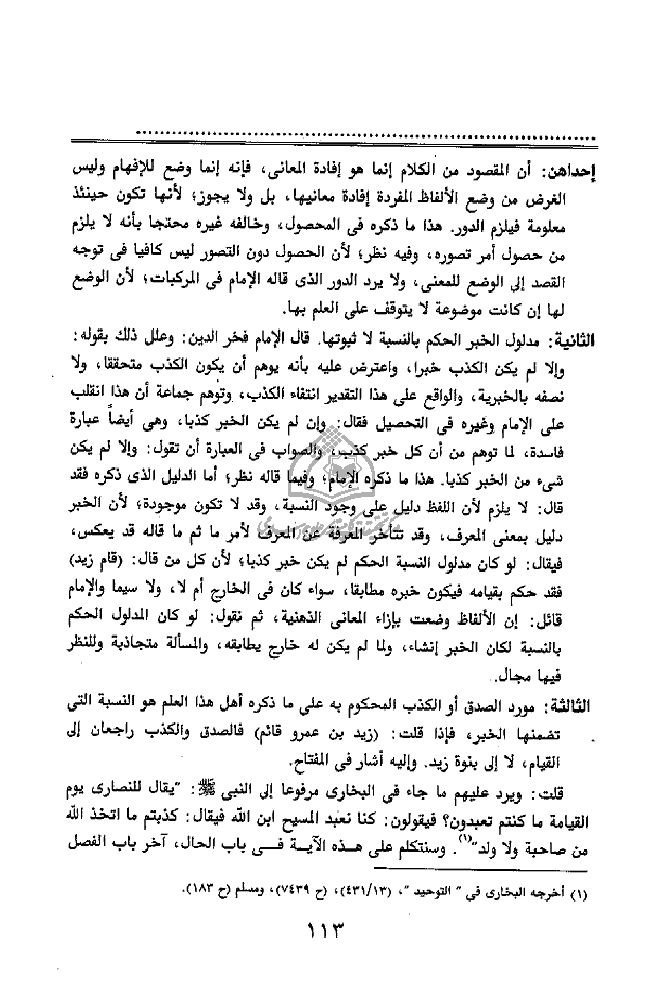 الثالثة: مورد الصدق أو الكذب المحكوم به على ما ذكره أهل هذا العلم هو النسبة التى تضمنها الخبر، فإذا قلت: (زيد بن عمرو قائم) فالصدق والكذب راجعان إلى القيام، لا إلى بنوة زيد. وإليه أشار فى المفتاح.