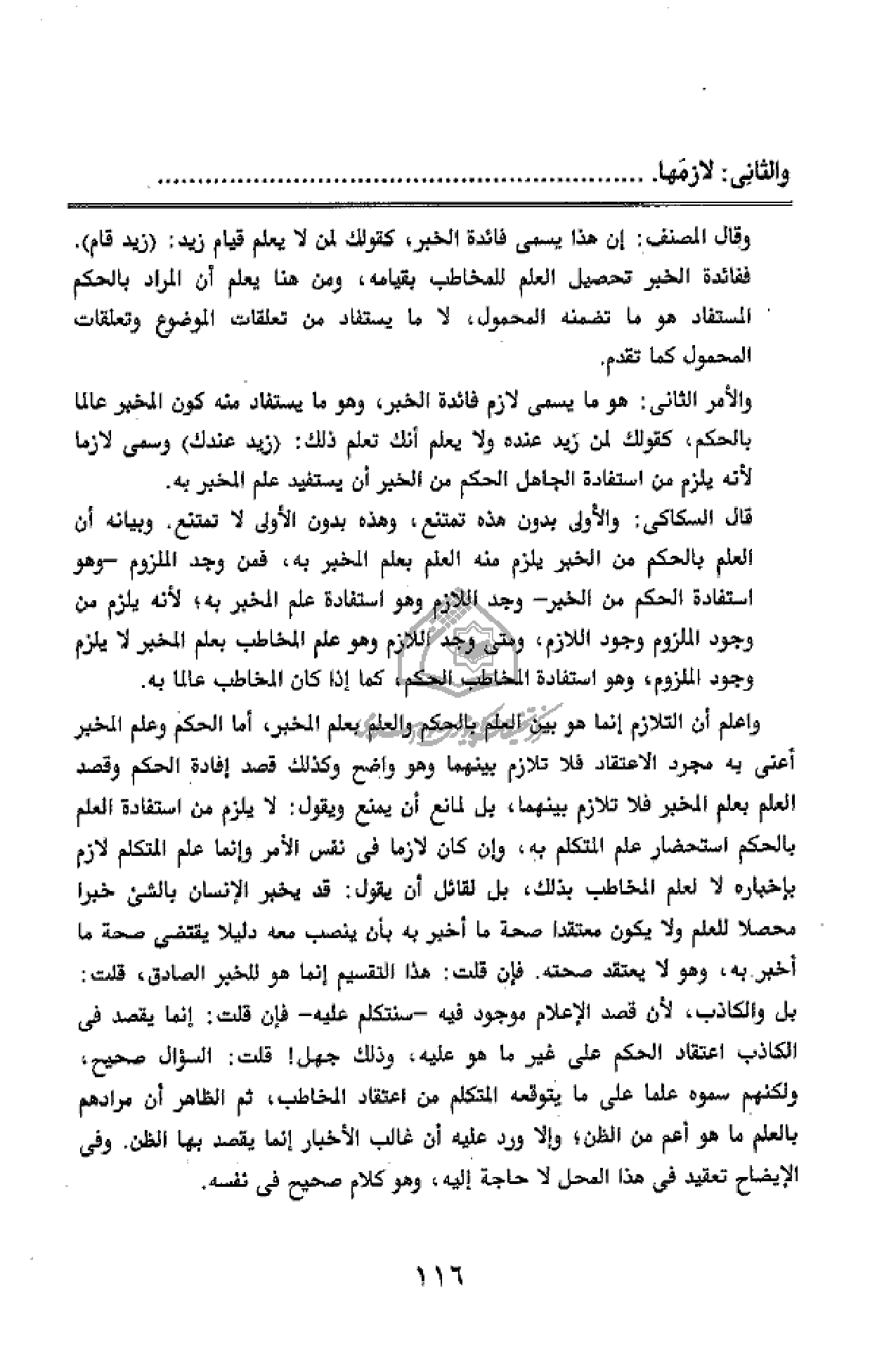 واعلم أن التلازم إنما هو بين العلم بالحكم والعلم بعلم المخبر، أما الحكم وعلم المخبر أعنى به مجرد الاعتقاد فلا تلازم بينهما وهو واضح وكذلك قصد إفادة الحكم وقصد العلم بعلم المخبر فلا تلازم بينهما، بل لمانع أن يمنع ويقول: لا يلزم من استفادة العلم بالحكم استحضار علم المتكلم به، وإن كان لازما فى نفس الأمر وإنما علم المتكلم لازم بإخباره لا لعلم المخاطب بذلك، بل لقائل أن يقول: قد يخبر الإنسان بالشئ خبرا محصلا للعلم ولا يكون معتقدا صحة ما أخبر به بأن ينصب معه دليلا يقتضى صحة ما أخبر به، وهو لا يعتقد صحته. فإن قلت: هذا التقسيم إنما هو للخبر الصادق، قلت: