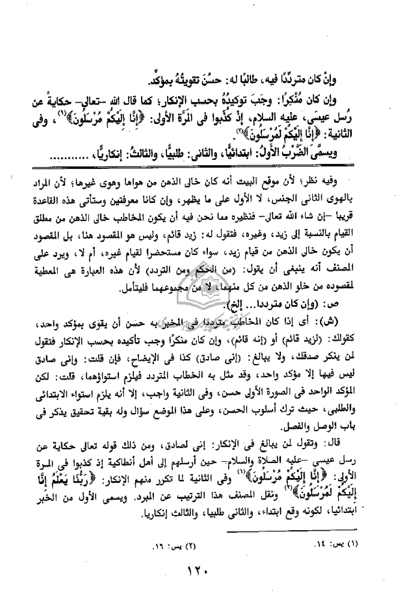 قال: وتقول لمن يبالغ فى الإنكار: إنى لصادق، ومن ذلك قوله تعالى حكاية عن رسل عيسى - عليه الصلاة والسّلام - حين أرسلهم إلى أهل أنطاكية إذ كذبوا فى المرة الأولى: إِنَّا إِلَيْكُمْ مُرْسَلُونَ «1» وفى الثانية لما تكرر منهم الإنكار: رَبُّنا يَعْلَمُ إِنَّا إِلَيْكُمْ لَمُرْسَلُونَ «2» ونقل المصنف هذا الترتيب عن المبرد. ويسمى الأول من الخبر ابتدائيا،