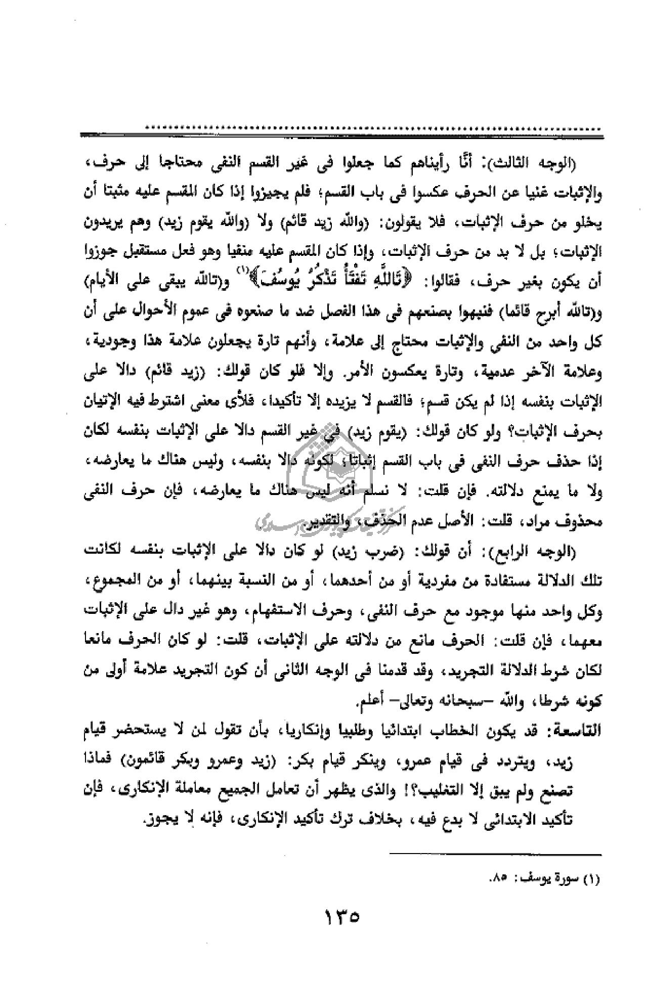(الوجه الثالث): أنّا رأيناهم كما جعلوا فى غير القسم النفى محتاجا إلى حرف، والإثبات غنيا عن الحرف عكسوا فى باب القسم؛ فلم يجيزوا إذا كان المقسم عليه مثبتا أن يخلو من حرف الإثبات، فلا يقولون: (والله زيد قائم) ولا (والله يقوم زيد) وهم يريدون الإثبات؛ بل لا بد من حرف الإثبات، وإذا كان المقسم عليه منفيا وهو فعل مستقبل جوزوا أن يكون بغير حرف، فقالوا: تَاللَّهِ تَفْتَؤُا تَذْكُرُ يُوسُفَ (¬1) و (تالله يبقى على الأيام) و (تالله أبرح قائما) فنبهوا بصنعهم فى هذا الفصل ضد ما صنعوه فى عموم الأحوال على أن كل واحد من النفى والإثبات محتاج إلى علامة، وأنهم تارة يجعلون علامة هذا وجودية، وعلامة الآخر عدمية، وتارة يعكسون الأمر. وإلا فلو كان قولك: (زيد قائم)