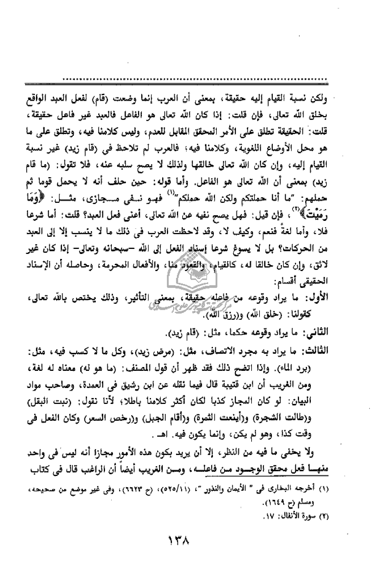 ولكن نسبة القيام إليه حقيقة، بمعنى أن العرب إنما وضعت (قام) لفعل العبد الواقع بخلق الله تعالى، فإن قلت: إذا كان الله تعالى هو الفاعل فالعبد غير فاعل حقيقة، قلت: الحقيقة تطلق على الأمر المحقق المقابل للعدم، وليس كلامنا فيه، وتطلق على ما هو محل الأوضاع اللغوية، وكلامنا فيه؛ فالعرب لم تلاحظ فى (قام زيد) غير نسبة القيام إليه، وإن كان الله تعالى خالقها ولذلك لا يصح سلبه عنه، فلا تقول: (ما قام زيد) بمعنى أن الله تعالى هو الفاعل. وأما قوله: حين حلف أنه لا يحمل قوما ثم حملهم:" ما أنا حملتكم ولكن الله حملكم" (¬1) فهو نفى مجازى، مثل: وَما رَمَيْتَ (¬2)، فإن قيل: فهل يصح نفيه عن الله تعالى، أعنى فعل العبد؟ قلت: أما شرعا فلا، وأما لغة فنعم، وكيف لا، وقد لاحظت العرب فى ذلك ما لا ينسب إلا إلى العبد من الحركات؟ بل لا يسوغ شرعا إسناد الفعل إلى الله - سبحانه وتعالى - إذا كان غير لائق، وإن كان خالقا له، كالقيام، والقعود منا، والأفعال المحرمة، وحاصله أن الإسناد الحقيقى أقسام: