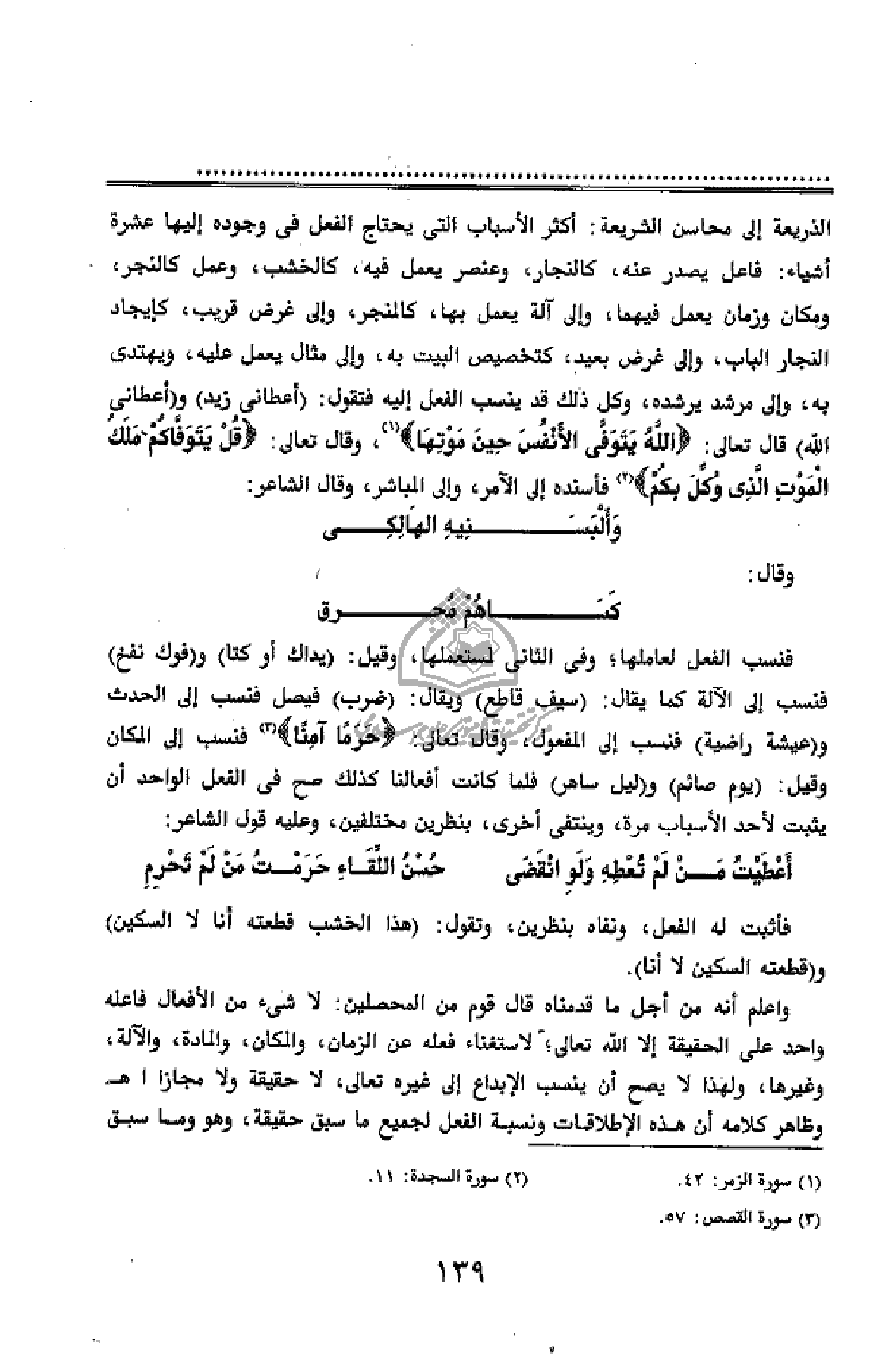 الذريعة إلى محاسن الشريعة: أكثر الأسباب التى يحتاج الفعل فى وجوده إليها عشرة أشياء: فاعل يصدر عنه، كالنجار، وعنصر يعمل فيه، كالخشب، وعمل كالنجر، ومكان وزمان يعمل فيهما، وإلى آلة يعمل بها، كالمنجر، وإلى غرض قريب، كإيجاد النجار الباب، وإلى غرض بعيد، كتخصيص البيت به، وإلى مثال يعمل عليه، ويهتدى به، وإلى مرشد يرشده، وكل ذلك قد ينسب الفعل إليه فتقول: (أعطانى زيد) و (أعطانى الله) قال تعالى: اللَّهُ يَتَوَفَّى الْأَنْفُسَ حِينَ مَوْتِها (¬1)، وقال تعالى: قُلْ يَتَوَفَّاكُمْ مَلَكُ الْمَوْتِ الَّذِي وُكِّلَ بِكُمْ (¬2) فأسنده إلى الآمر، وإلى المباشر، وقال الشاعر: