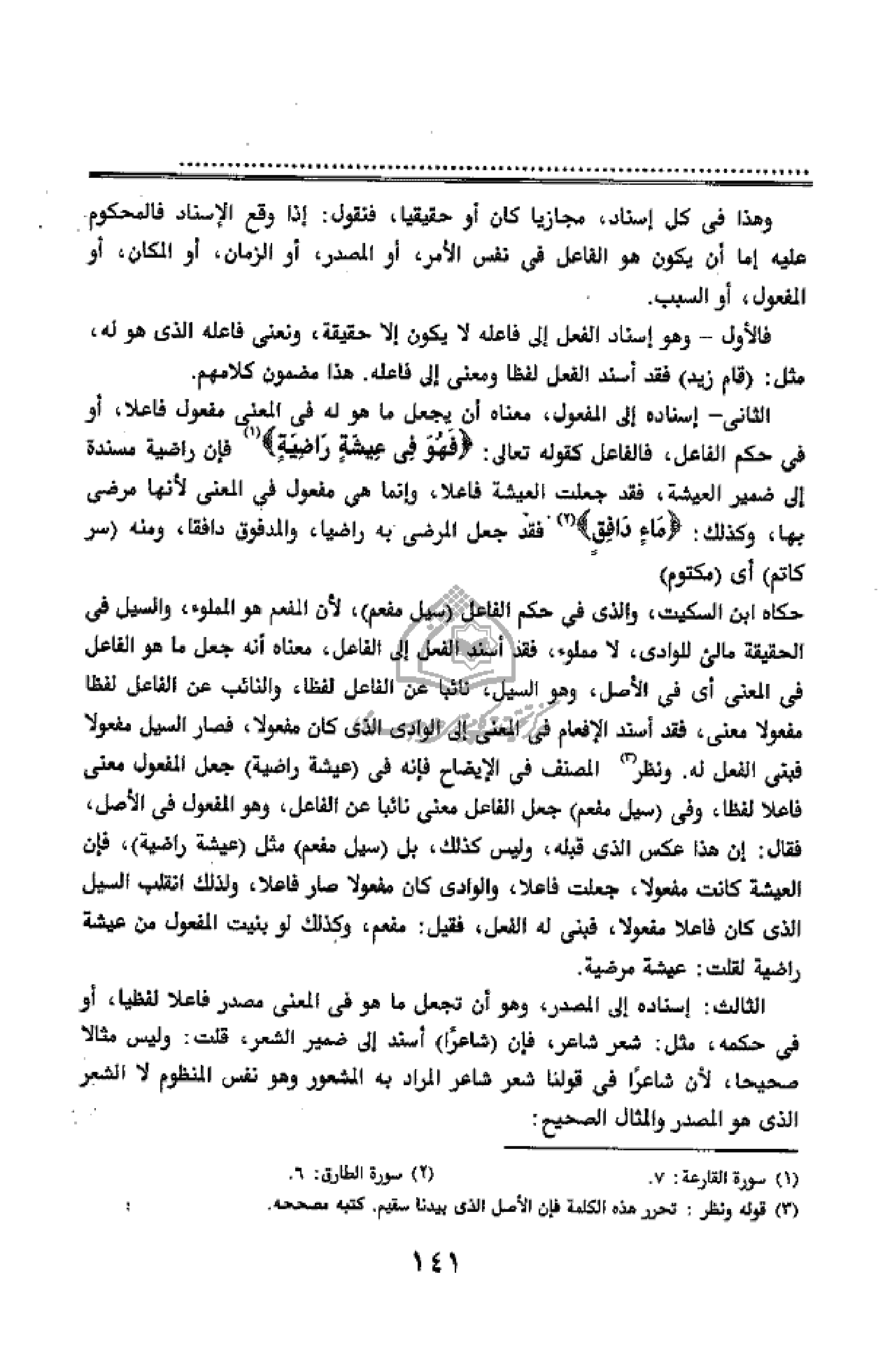 الثانى - إسناده إلى المفعول، معناه أن يجعل ما هو له فى المعنى مفعول فاعلا، أو فى حكم الفاعل، فالفاعل كقوله تعالى: فَهُوَ فِي عِيشَةٍ راضِيَةٍ (¬1) فإن راضية مسندة إلى ضمير العيشة، فقد جعلت العيشة فاعلا، وإنما هى مفعول فى المعنى لأنها مرضى بها، وكذلك: ماءٍ دافِقٍ (¬2) فقد جعل المرضى به راضيا، والمدفوق دافقا، ومنه (سر كاتم) أى (مكتوم)