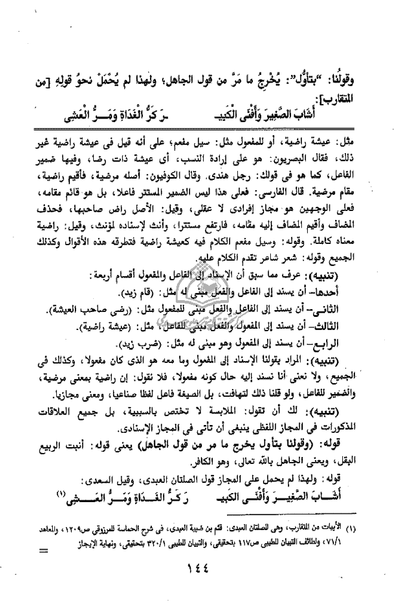 (تنبيه): المراد بقولنا الإسناد إلى المفعول وما معه هو الذى كان مفعولا، وكذلك فى الجميع، ولا نعنى أنا نسند إليه حال كونه مفعولا، فلا نقول: إن راضية بمعنى مرضية، والضمير للفاعل، ولو قلنا ذلك لتهافت، بل الصيغة فاعل لفظا صناعيا، ومعنى مجازيا.