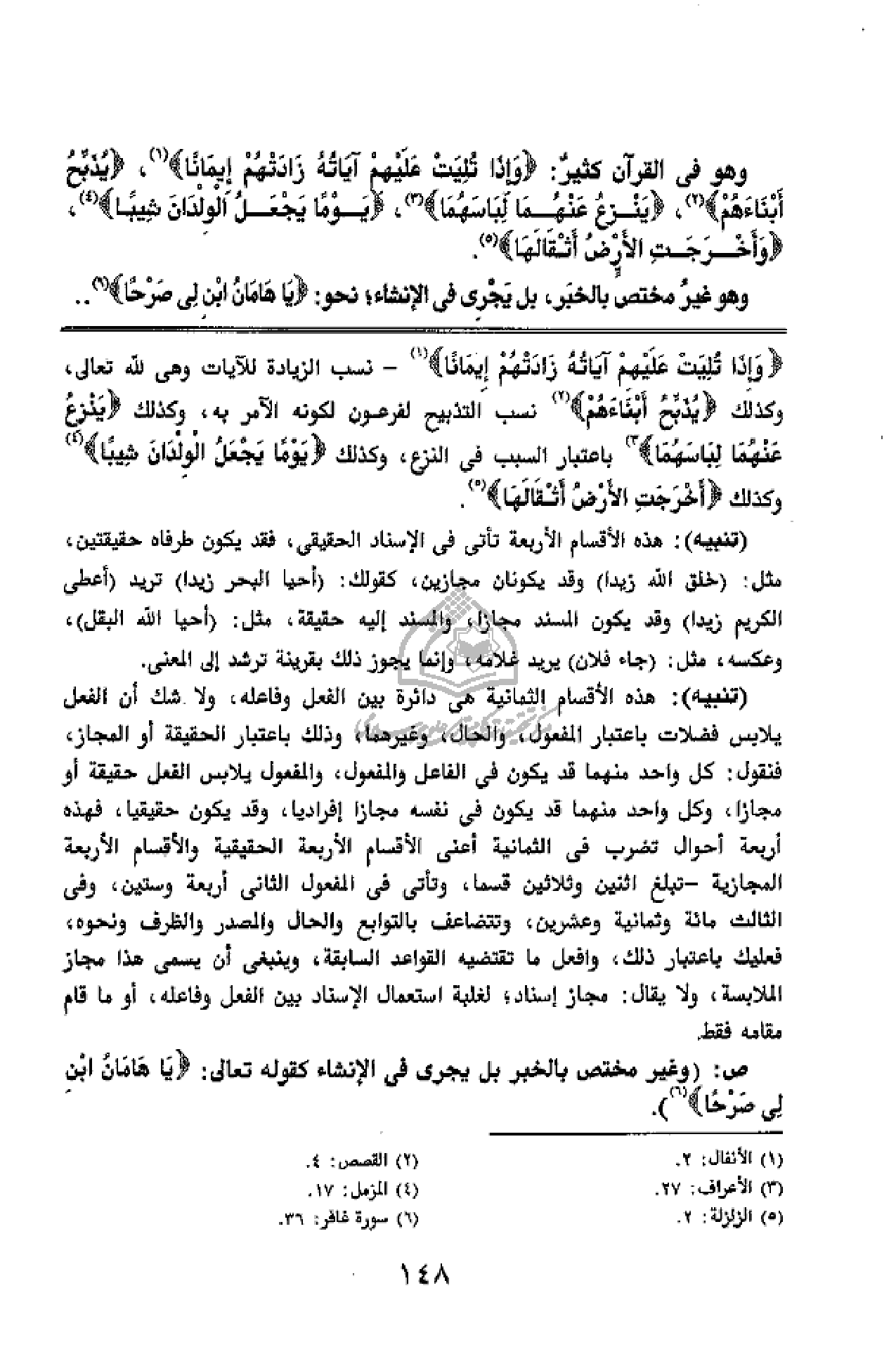 (تنبيه): هذه الأقسام الأربعة تأتى فى الإسناد الحقيقى، فقد يكون طرفاه حقيقتين، مثل: (خلق الله زيدا) وقد يكونان مجازين، كقولك: (أحيا البحر زيدا) تريد (أعطى الكريم زيدا) وقد يكون المسند مجازا، والمسند إليه حقيقة، مثل: (أحيا الله البقل)، وعكسه، مثل: (جاء فلان) يريد غلامه، وإنما يجوز ذلك بقرينة ترشد إلى المعنى.