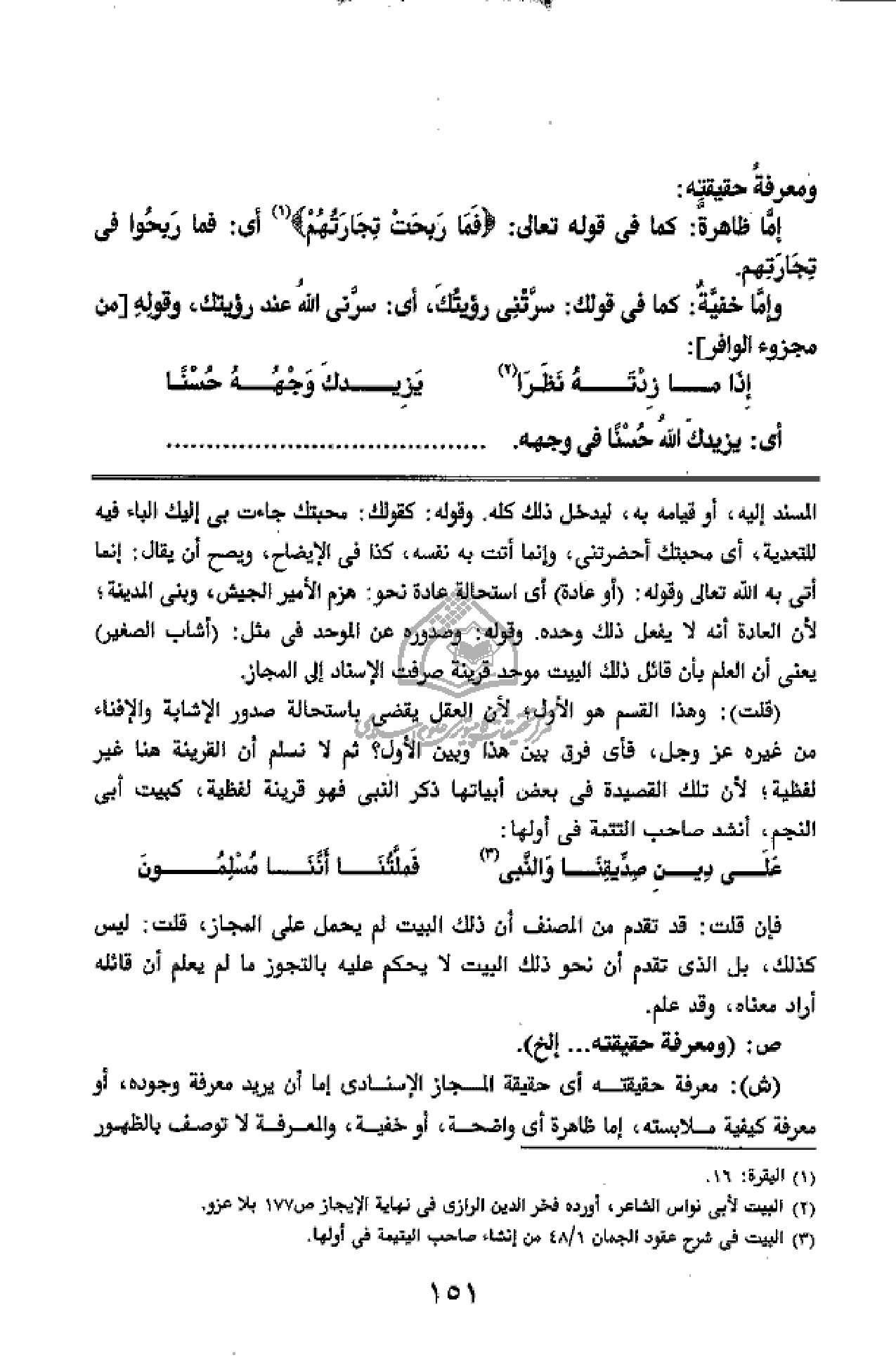 (قلت): وهذا القسم هو الأول؛ لأن العقل يقضى باستحالة صدور الإشابة والإفناء من غيره عز وجل، فأى فرق بين هذا وبين الأول؟ ثم لا نسلم أن القرينة هنا غير لفظية؛ لأن تلك القصيدة فى بعض أبياتها ذكر النبى فهو قرينة لفظية، كبيت أبى النجم، أنشد صاحب التتمة فى أولها: