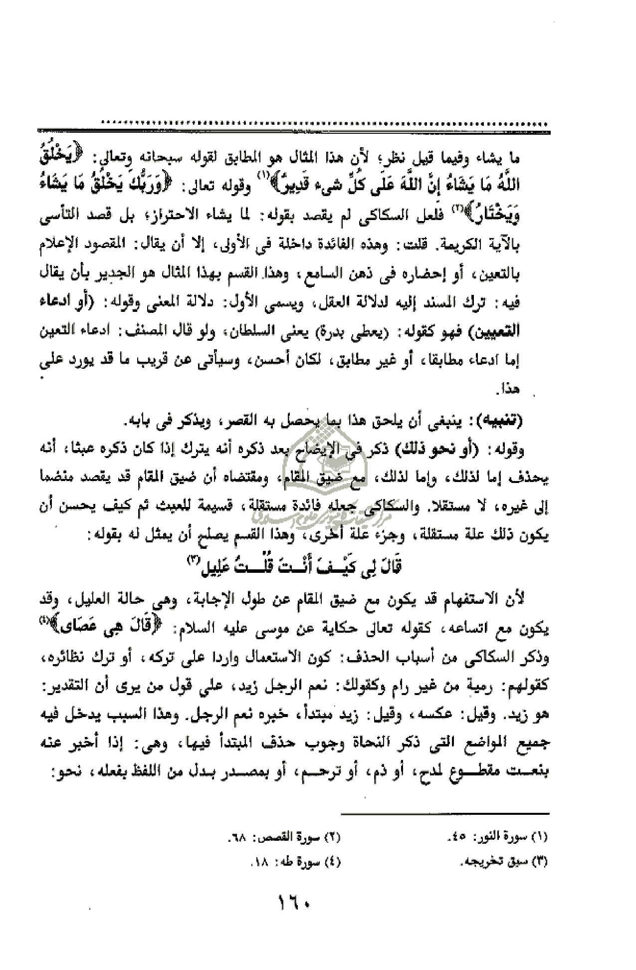 ما يشاء وفيما قيل نظر؛ لأن هذا المثال هو المطابق لقوله سبحانه وتعالى: يَخْلُقُ اللَّهُ ما يَشاءُ إِنَّ اللَّهَ عَلى كُلِّ شَيْءٍ قَدِيرٌ (¬1) وقوله تعالى: وَرَبُّكَ يَخْلُقُ ما يَشاءُ وَيَخْتارُ (¬2) فلعل السكاكى لم يقصد بقوله: لما يشاء الاحتراز؛ بل قصد التأسى بالآية الكريمة. قلت: وهذه الفائدة داخلة فى الأولى، إلا أن يقال: المقصود الإعلام بالتعين، أو إحضاره فى ذهن السامع، وهذا القسم بهذا المثال هو الجدير بأن يقال فيه: ترك المسند إليه لدلالة العقل، ويسمى الأول: دلالة