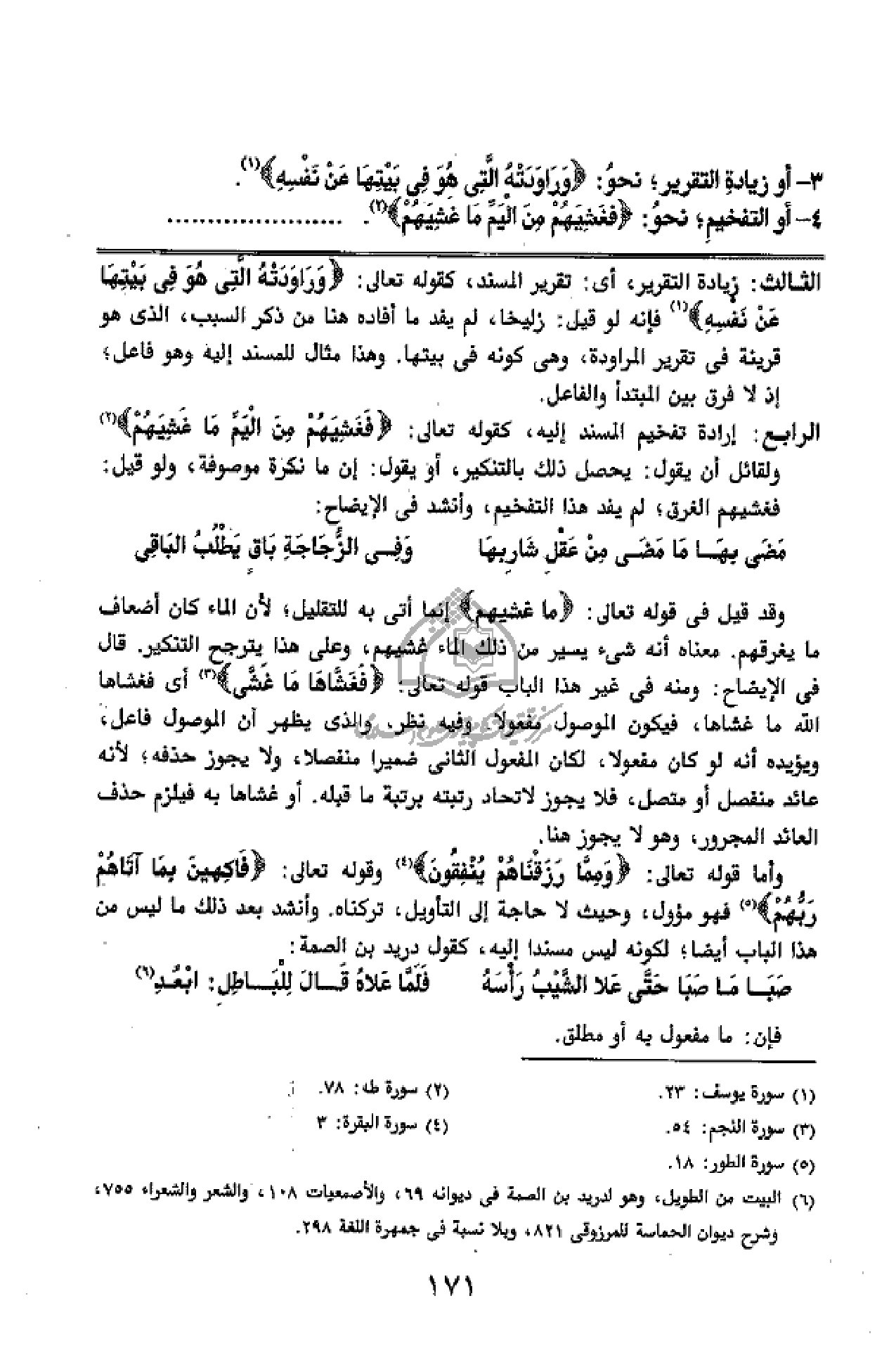 ذلك الماء غشيهم، وعلى هذا يترجح التنكير. قال فى الإيضاح: ومنه فى غير هذا الباب قوله تعالى: فَغَشَّاها ما غَشَّى (¬3) أى فغشاها الله ما غشاها، فيكون الموصول مفعولا. وفيه نظر، والذى يظهر أن الموصول فاعل، ويؤيده أنه لو كان مفعولا، لكان المفعول الثانى ضميرا منفصلا، ولا يجوز حذفه؛ لأنه عائد منفصل أو متصل، فلا يجوز لاتحاد رتبته برتبة ما قبله. أو غشاها به فيلزم حذف العائد المجرور، وهو لا يجوز هنا.