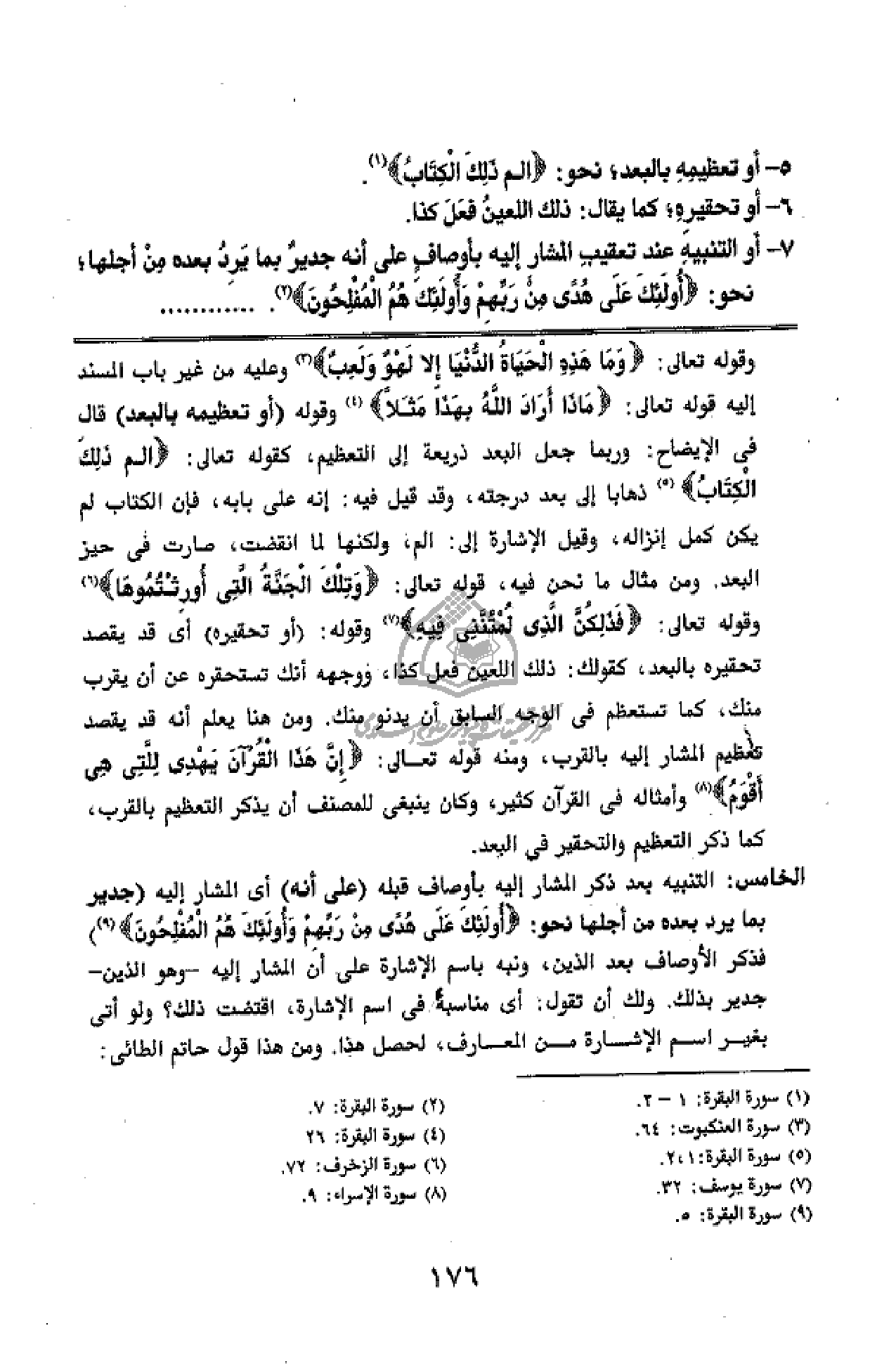 5 - أو تعظيمه بالبعد؛ نحو: الم ذلِكَ الْكِتابُ (¬1).