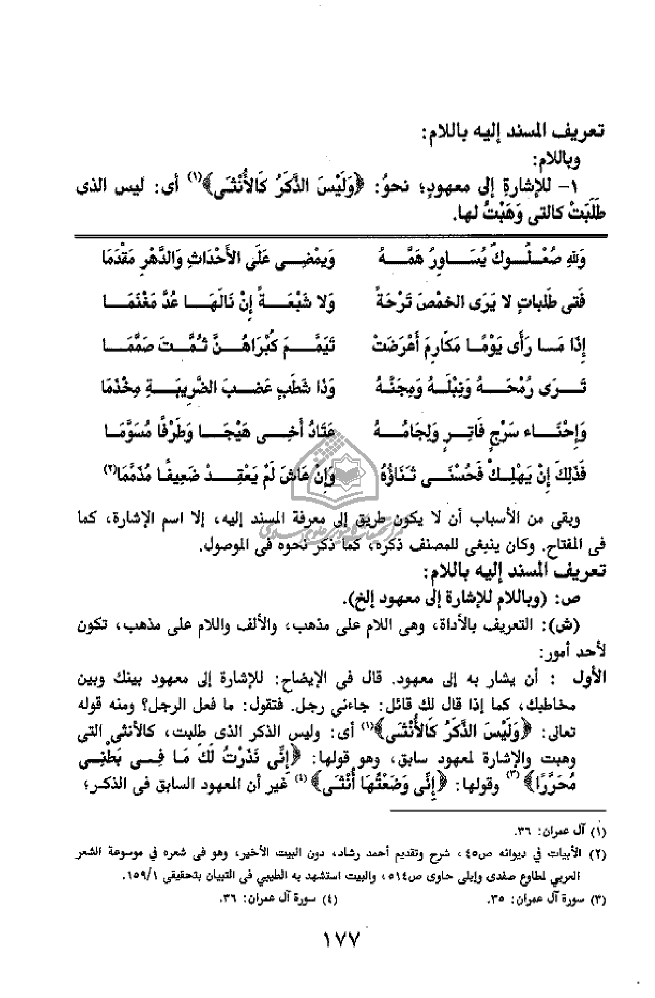 1 - للإشارة إلى معهود؛ نحو: وَلَيْسَ الذَّكَرُ كَالْأُنْثى (¬1) أى: ليس الذى طلبت كالتى وهبت لها.