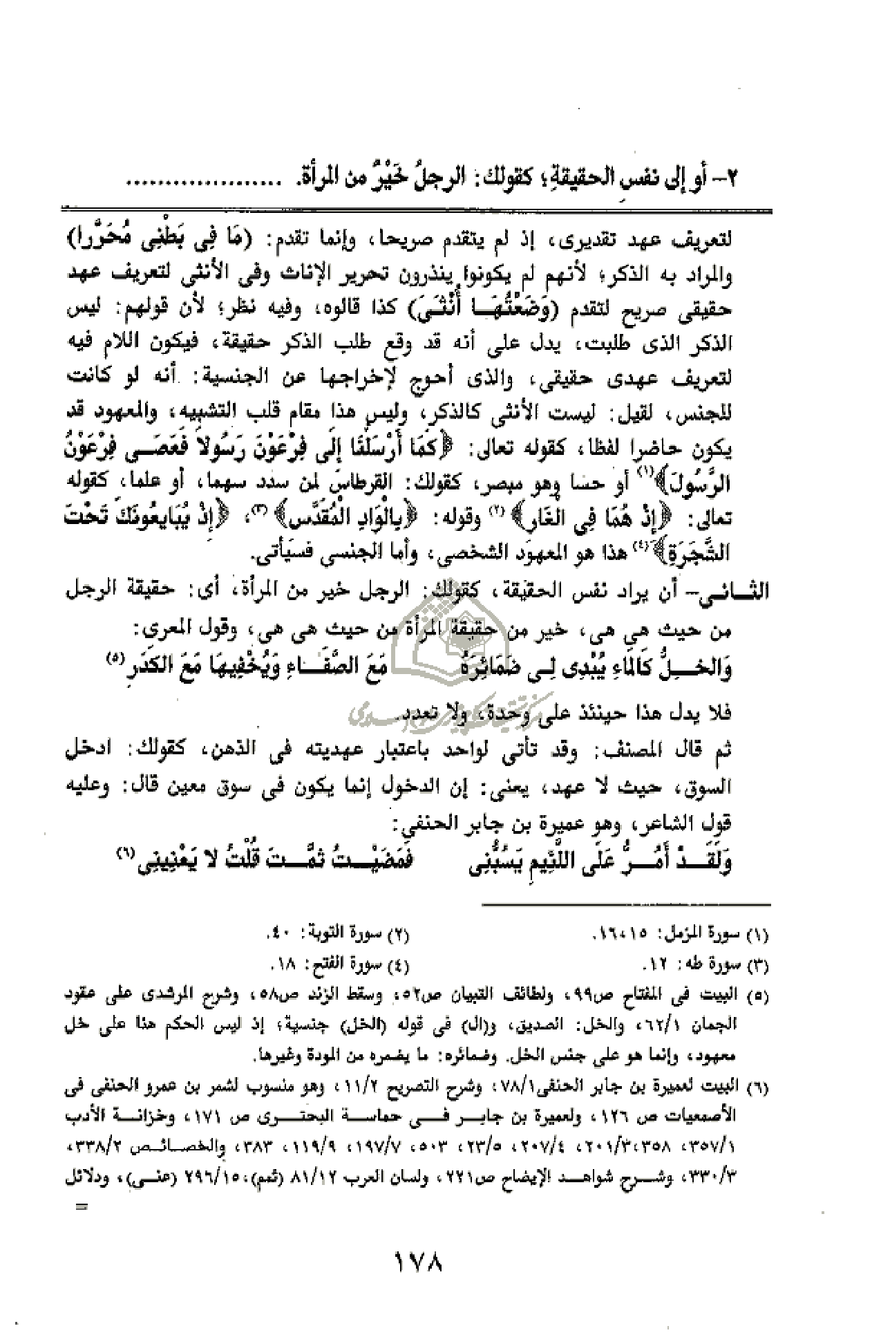 الثانى - أن يراد نفس الحقيقة، كقولك: الرجل خير من المرأة، أى: حقيقة الرجل من حيث هى هى، خير من حقيقة المرأة من حيث هى هى، وقول المعرى: