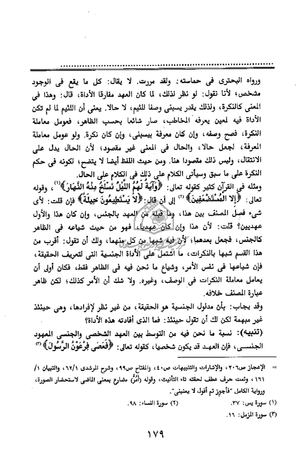 ومثله فى القرآن كثير كقوله تعالى: وَآيَةٌ لَهُمُ اللَّيْلُ نَسْلَخُ مِنْهُ النَّهارَ (¬1)، وقوله تعالى: إِلَّا الْمُسْتَضْعَفِينَ (¬2) إلى أن قال: لا يَسْتَطِيعُونَ حِيلَةً فإن قلت: لأى شئ فصل المصنف بين هذا، وما قبله من العهد بالجنس، وإن كان هذا والأول عهديين؟ قلت: لأن هذا وإن كان عهديا، فهو من حيث شياعه فى الظاهر كالجنس، فجعل بعدهما؛ لأن فيه شبها من كل منهما، ولك أن تقول: أقرب من هذا القسم شبها بالنكرات، ما اشتمل على الأداة الجنسية التى لتعريف الحقيقة، فإن شياعها فى نفس الأمر، وشياع ما نحن فيه فى الظاهر فقط، فكان أولى أن يعامل معاملة النكرات فى الوصف، وغيره. ولا شك أن الأمر كذلك؛ لكن ظاهر عبارة المصنف خلافه.