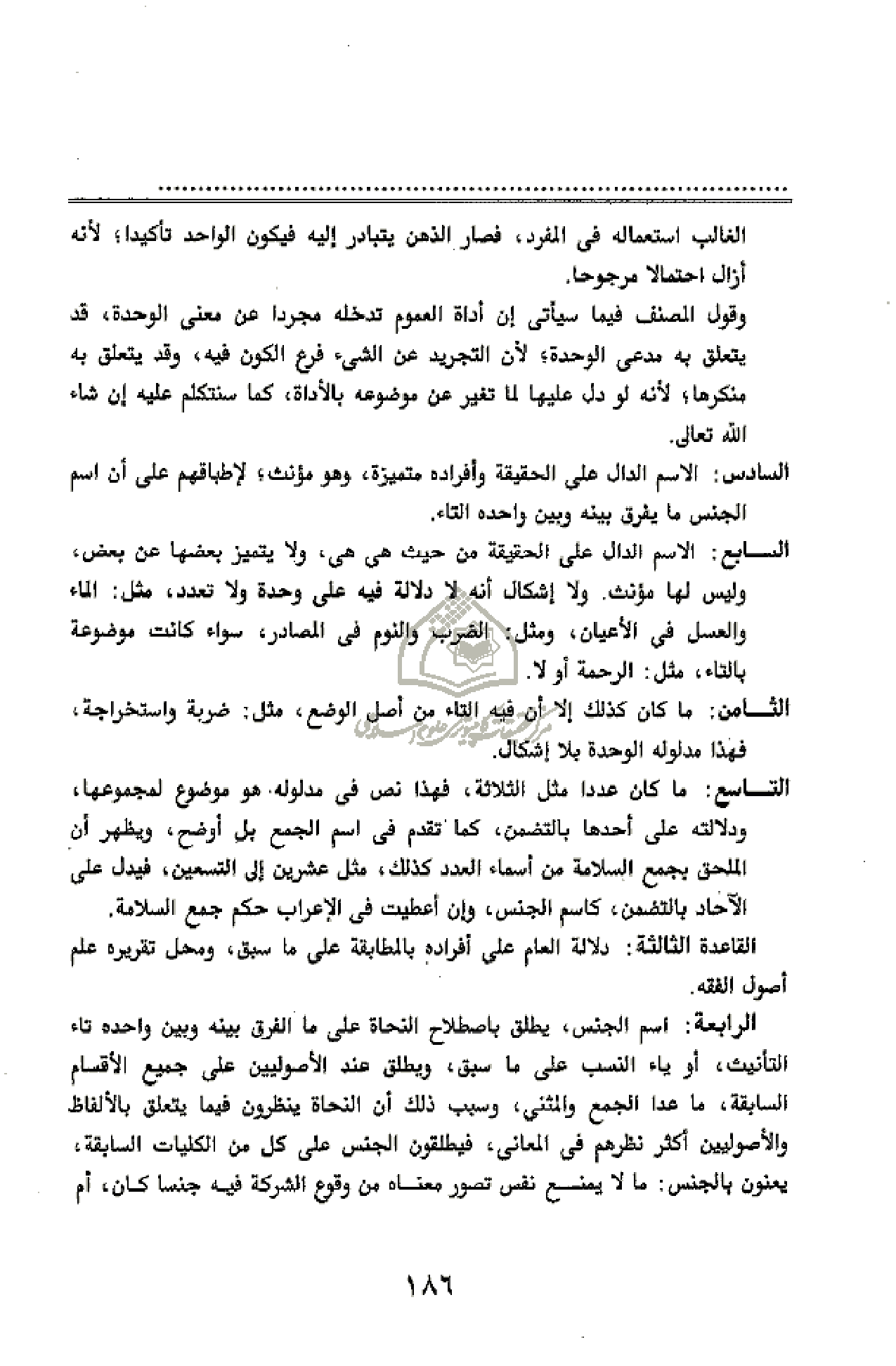 السابع: الاسم الدال على الحقيقة من حيث هى هى، ولا يتميز بعضها عن بعض، وليس لها مؤنث. ولا إشكال أنه لا دلالة فيه على وحدة ولا تعدد، مثل: الماء والعسل فى الأعيان، ومثل: الضرب والنوم فى المصادر، سواء كانت موضوعة بالتاء، مثل: الرحمة أو لا.