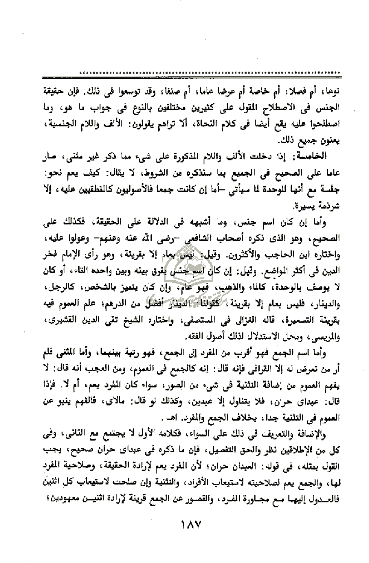 نوعا، أم فصلا، أم خاصة أم عرضا عاما، أم صنفا، وقد توسعوا فى ذلك. فإن حقيقة الجنس فى الاصطلاح المقول على كثيرين مختلفين بالنوع فى جواب ما هو، وما اصطلحوا عليه يقع أيضا فى كلام النحاة، ألا تراهم يقولون: الألف واللام الجنسية، يعنون جميع ذلك.