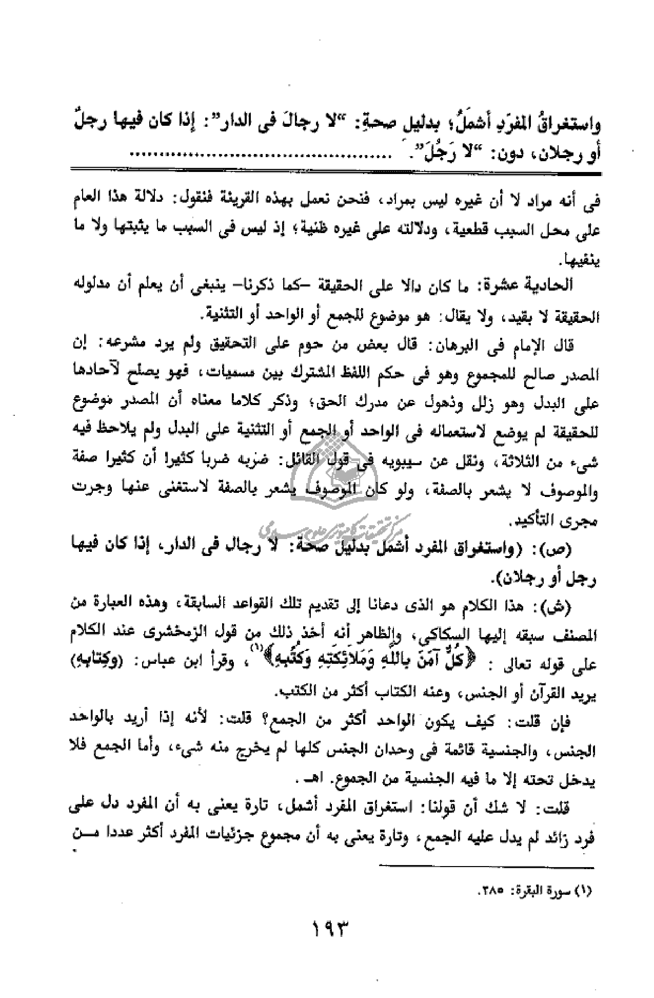 (ص): (واستغراق المفرد أشمل بدليل صحة: لا رجال فى الدار، إذا كان فيها رجل أو رجلان).