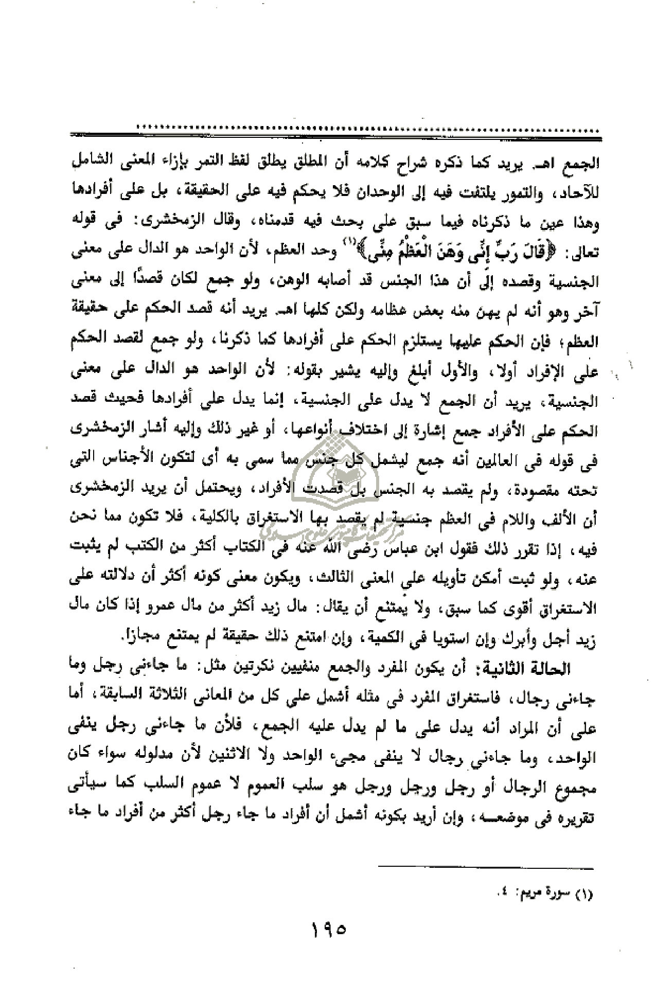 الحالة الثانية: أن يكون المفرد والجمع منفيين نكرتين مثل: ما جاءنى رجل وما جاءنى رجال، فاستغراق المفرد فى مثله أشمل على كل من المعانى الثلاثة السابقة، أما على أن المراد أنه يدل على ما لم يدل عليه الجمع، فلأن ما جاءنى رجل ينفى الواحد، وما جاءنى رجال لا ينفى مجئ الواحد ولا الاثنين لأن مدلوله سواء كان مجموع الرجال أو رجل ورجل ورجل هو سلب العموم لا عموم السلب كما سيأتى تقريره فى موضعه، وإن أريد بكونه أشمل أن أفراد ما جاء رجل أكثر من أفراد ما جاء