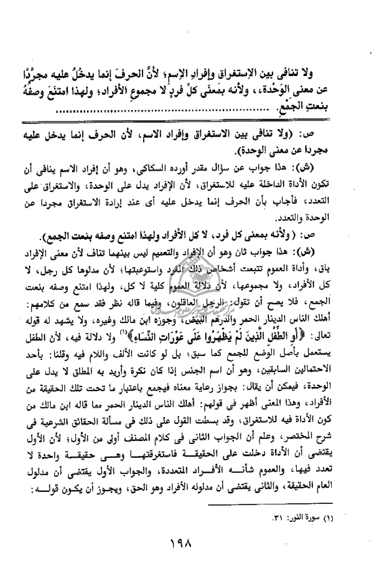 (ش): هذا جواب ثان وهو أن الإفراد والتعميم ليس بينهما تناف لأن معنى الإفراد باق، وأداة العموم تتبعت أشخاص ذلك المفرد واستوعبتها؛ لأن مدلولها كل رجل، لا كل الأفراد، ولا مجموعها، لأن دلالة العموم كلية لا كل، ولهذا امتنع وصفه بنعت الجمع، فلا يصح أن تقول: الرجل العاقلون، وفيما قاله نظر فقد سمع من كلامهم: