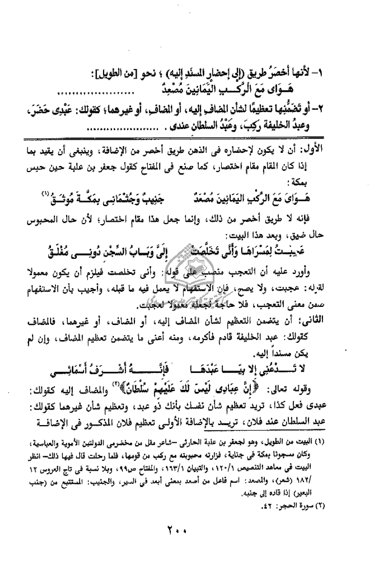 الأول: أن لا يكون لإحضاره في الذهن طريق أخصر من الإضافة، وينبغى أن يقيد بما إذا كان المقام مقام اختصار، كما صنع فى المفتاح كقول جعفر بن علبة حين حبس بمكة: