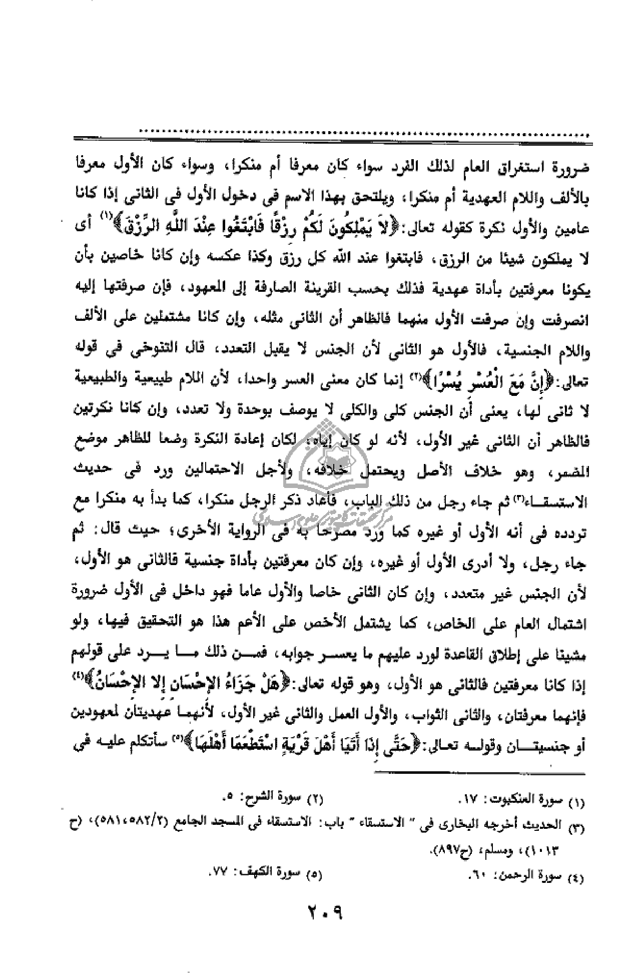 صرفت الأول منهما فالظاهر أن الثانى مثله، وإن كانا مشتملين على الألف واللام الجنسية، فالأول هو الثانى لأن الجنس لا يقبل التعدد، قال التنوخى فى قوله تعالى: إِنَّ مَعَ الْعُسْرِ يُسْراً (¬2) إنما كان معنى العسر واحدا، لأن اللام طبيعية والطبيعية لا ثانى لها، يعنى أن الجنس كلى والكلى لا يوصف بوحدة ولا تعدد، وإن كانا نكرتين فالظاهر أن الثانى غير الأول، لأنه لو كان إياه، لكان إعادة النكرة وضعا للظاهر موضع المضمر، وهو خلاف الأصل ويحتمل خلافه، ولأجل الاحتمالين ورد فى حديث الاستسقاء (¬3) ثم جاء رجل من ذلك الباب، فأعاد ذكر الرجل منكرا، كما بدأ به منكرا مع تردده فى أنه الأول أو غيره كما ورد مصرحا به فى الرواية الأخرى؛ حيث قال: ثم جاء رجل، ولا أدرى الأول أو غيره، وإن كان معرفتين بأداة جنسية فالثانى هو الأول، لأن الجنس غير متعدد، وإن كان الثانى خاصا والأول عاما فهو داخل فى الأول ضرورة اشتمال العام على الخاص، كما يشتمل الأخص على الأعم هذا هو التحقيق فيها، ولو مشينا على إطلاق القاعدة لورد عليهم ما يعسر جوابه، فمن ذلك ما يرد على قولهم إذا كانا معرفتين فالثانى هو الأول، وهو قوله تعالى: هَلْ جَزاءُ الْإِحْسانِ إِلَّا الْإِحْسانُ (¬4) فإنهما معرفتان، والثانى الثواب، والأول العمل والثانى غير الأول، لأنهما عهديتان لمعهودين أو جنسيتان وقوله تعالى: حَتَّى إِذا أَتَيا أَهْلَ قَرْيَةٍ اسْتَطْعَما أَهْلَها (¬5) سأتكلم عليه فى