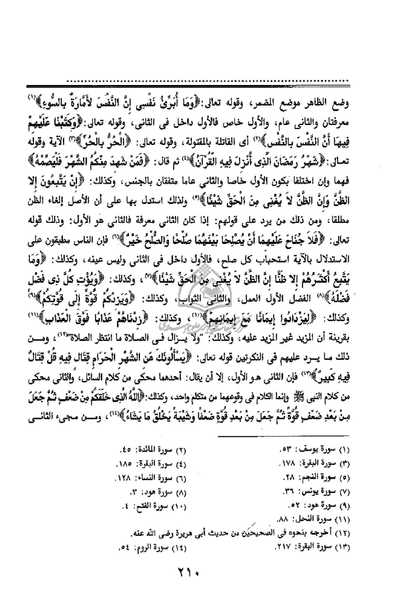 وضع الظاهر موضع المضمر، وقوله تعالى: وَما أُبَرِّئُ نَفْسِي إِنَّ النَّفْسَ لَأَمَّارَةٌ بِالسُّوءِ (¬1) معرفتان والثانى عام، والأول خاص فالأول داخل فى الثانى، وقوله تعالى: وَكَتَبْنا عَلَيْهِمْ فِيها أَنَّ النَّفْسَ بِالنَّفْسِ (¬2) أى القاتلة بالمقتولة، وقوله تعالى: الْحُرُّ بِالْحُرِّ (¬3) الآية وقوله تعالى: شَهْرُ رَمَضانَ الَّذِي أُنْزِلَ فِيهِ الْقُرْآنُ (¬4) ثم قال: فَمَنْ شَهِدَ مِنْكُمُ الشَّهْرَ فَلْيَصُمْهُ فهما وإن اختلفا بكون الأول خاصا والثانى عاما متفقان بالجنس، وكذلك: إِنْ يَتَّبِعُونَ إِلَّا الظَّنَّ وَإِنَّ الظَّنَّ لا يُغْنِي مِنَ الْحَقِّ شَيْئاً (¬5) ولذلك استدل بها على أن الأصل إلغاء الظن مطلقا، ومن ذلك من يرد على قولهم: إذا كان الثانى معرفة فالثانى هو الأول: وذلك قوله تعالى: فَلا جُناحَ عَلَيْهِما أَنْ يُصْلِحا بَيْنَهُما صُلْحاً وَالصُّلْحُ خَيْرٌ (¬6) فإن