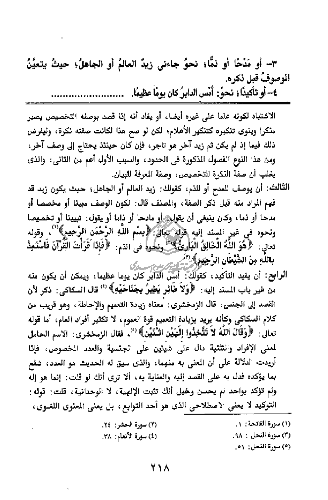 3 - أو مدحا أو ذمّا؛ نحو جاءنى زيد العالم أو الجاهل؛ حيث يتعيّن الموصوف قبل ذكره.