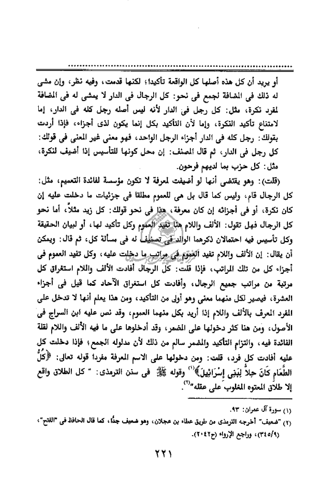أو لبيان الحقيقة وكل تأسيس فيه احتمالان ذكرهما الوالد فى تصنيف له فى مسألة كل، ثم قال: ويمكن أن يقال: إن الألف واللام تفيد العموم فى مراتب ما دخلت عليه، وكل تفيد العموم فى أجزاء كل من تلك المراتب، فإذا قلت: كل الرجال أفادت الألف واللام استغراق كل مرتبة من مراتب جميع الرجال، وأفادت كل استغراق الآحاد كما قيل فى أجزاء العشرة، فيصير لكل منهما معنى وهو أولى من التأكيد، ومن هذا يعلم أنها لا تدخل على المفرد المعرف بالألف واللام إذا أريد بكل منهما العموم، وقد نص عليه ابن السراج فى الأصول، ومن هنا كثر دخولها على المضمر، وقد أدخلوها على ما فيه الألف واللام لقلة الفائدة فيه، والتزام التأكيد والمضمر سالم من ذلك لأن مدلوله الجمع؛ فإذا دخلت كل عليه أفادت كل فرد، قلت: ومن دخولها على الاسم المعرفة مفردا قوله تعالى: كُلُّ الطَّعامِ كانَ حِلًّا لِبَنِي إِسْرائِيلَ (¬1) وقوله صلّى الله عليه وسلّم فى سنن الترمذى:" كل الطلاق واقع إلا طلاق المعتوه المغلوب على عقله" (¬2).