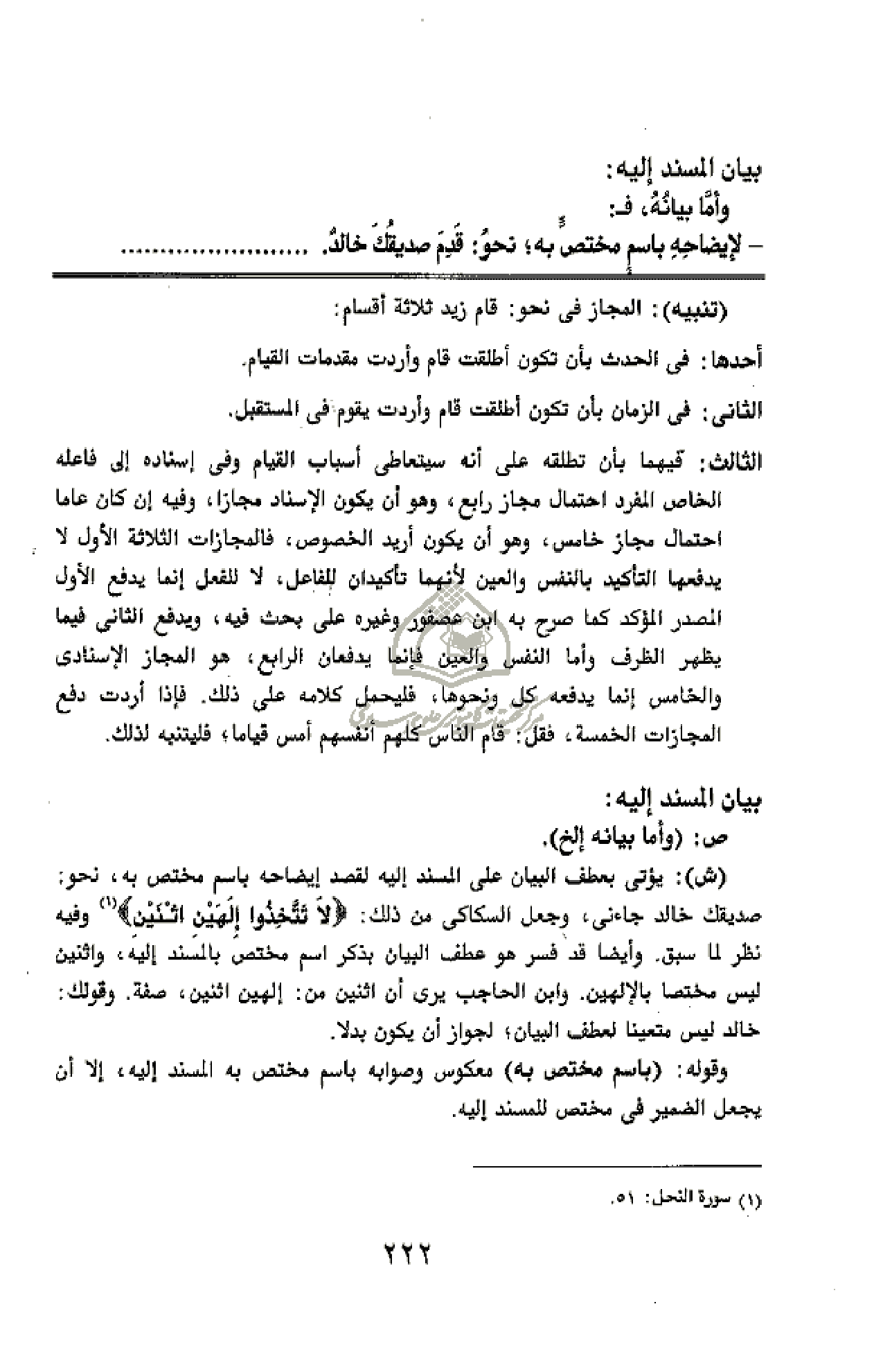 الثالث: فيهما بأن تطلقه على أنه سيتعاطى أسباب القيام وفى إسناده إلى فاعله الخاص المفرد احتمال مجاز رابع، وهو أن يكون الإسناد مجازا، وفيه إن كان عاما احتمال مجاز خامس، وهو أن يكون أريد الخصوص، فالمجازات الثلاثة الأول لا يدفعها التأكيد بالنفس والعين لأنهما تأكيدان للفاعل، لا للفعل إنما يدفع الأول المصدر المؤكد كما صرح به ابن عصفور وغيره على بحث فيه، ويدفع الثانى فيما يظهر الظرف وأما النفس والعين فإنما يدفعان الرابع، هو المجاز الإسنادى والخامس إنما يدفعه كل ونحوها، فليحمل كلامه على ذلك. فإذا أردت دفع المجازات الخمسة، فقل: قام الناس كلهم أنفسهم أمس قياما؛ فليتنبه لذلك.