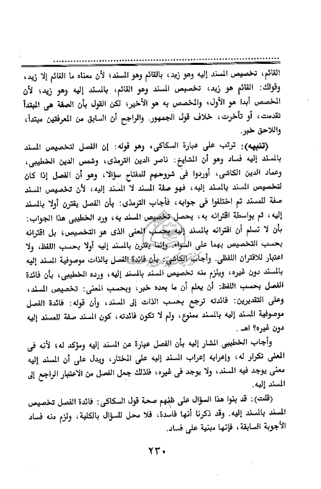 (تنبيه): ترتب على عبارة السكاكى، وهو قوله: إن الفصل لتخصيص المسند بالمسند إليه فساد وهو أن المشايخ: ناصر الدين الترمذى، وشمس الدين الخطيبى، وعماد الدين الكاشى، أوردوا فى شروحهم للمفتاح سؤالا، وهو أن الفصل إذا كان لتخصيص المسند بالمسند إليه، فهو صفة المسند لا المسند إليه؛ لأن تخصيص المسند صفة للمسند ثم اختلفوا فى جوابه، فأجاب الترمذى: بأن الفصل يقترن أولا بالمسند إليه، ثم بواسطة اقترانه به، يحصل تخصيص المسند به، ورد الخطيبى هذا الجواب: