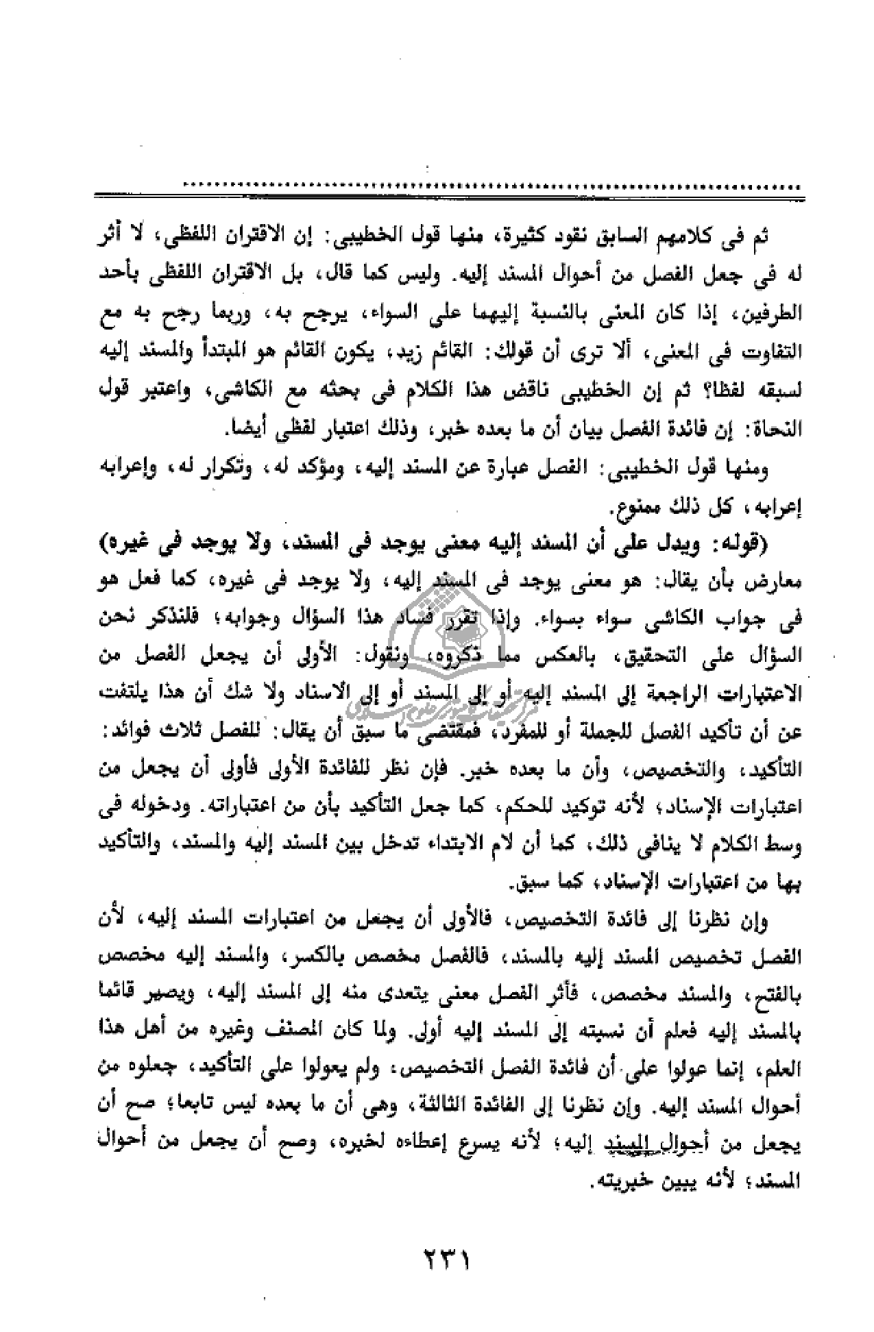 ثم فى كلامهم السابق نقود كثيرة، منها قول الخطيبى: إن الاقتران اللفظى، لا أثر له فى جعل الفصل من أحوال المسند إليه. وليس كما قال، بل الاقتران اللفظى بأحد الطرفين، إذا كان المعنى بالنسبة إليهما على السواء، يرجح به، وربما رجح به مع التفاوت فى المعنى، ألا ترى أن قولك: القائم زيد، يكون القائم هو المبتدأ والمسند إليه لسبقه لفظا؟ ثم إن الخطيبى ناقض هذا الكلام فى بحثه مع الكاشى، واعتبر قول النحاة: إن فائدة الفصل بيان أن ما بعده خبر، وذلك اعتبار لفظى أيضا.