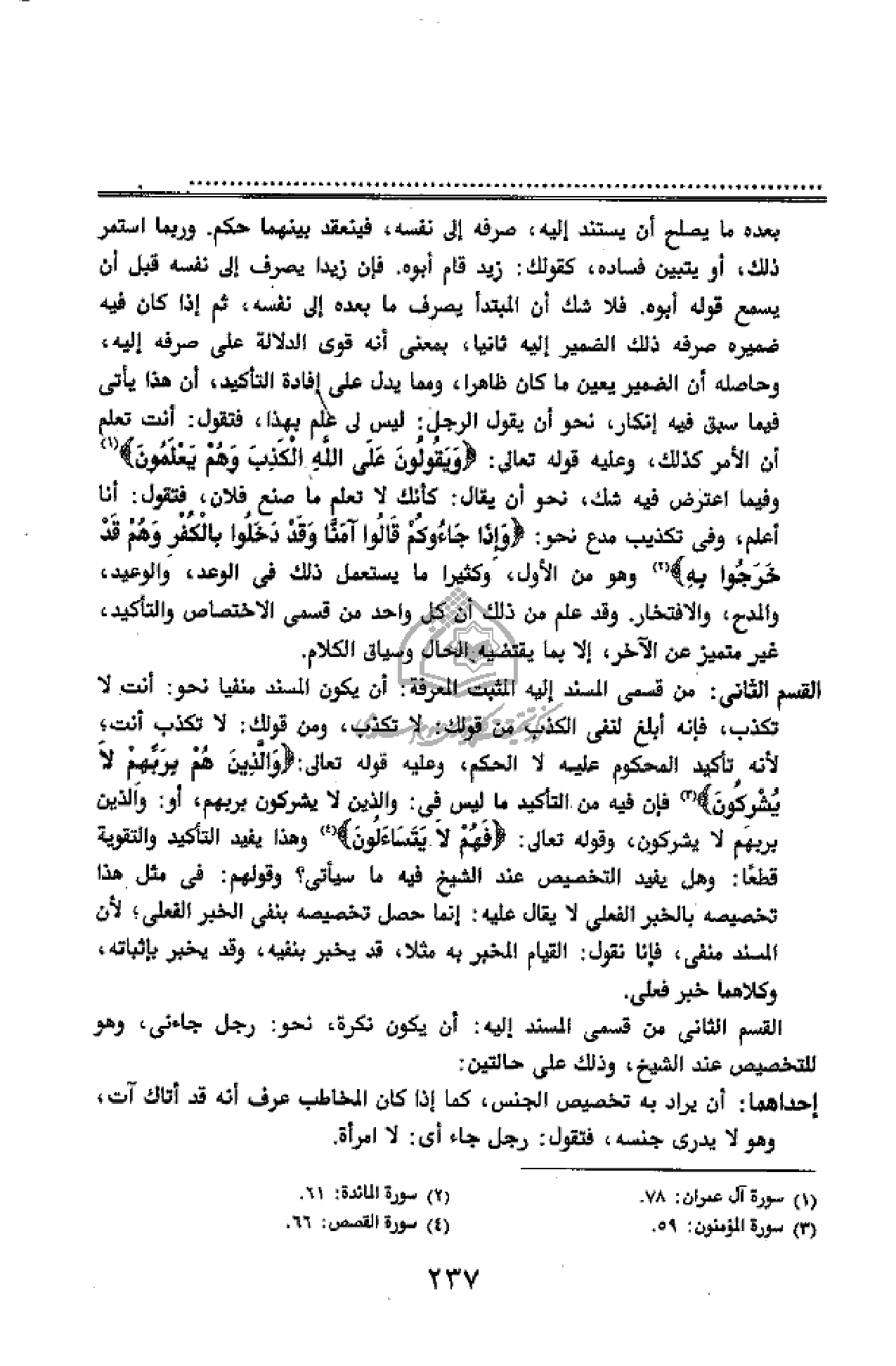 القسم الثانى: من قسمى المسند إليه المثبت المعرفة: أن يكون المسند منفيا نحو: أنت لا تكذب، فإنه أبلغ لنفى الكذب من قولك: لا تكذب، ومن قولك: لا تكذب أنت؛ لأنه تأكيد المحكوم عليه لا الحكم، وعليه قوله تعالى: وَالَّذِينَ هُمْ بِرَبِّهِمْ لا يُشْرِكُونَ (¬3) فإن فيه من التأكيد ما ليس فى: والذين لا يشركون بربهم، أو: والذين بربهم لا يشركون، وقوله تعالى: فَهُمْ لا يَتَساءَلُونَ (¬4) وهذا يفيد التأكيد والتقوية قطعا: وهل يفيد التخصيص عند الشيخ فيه ما سيأتى؟ وقولهم: فى مثل هذا تخصيصه بالخبر الفعلى لا يقال عليه: إنما حصل تخصيصه بنفى الخبر الفعلى؛ لأن المسند منفى، فإنا نقول: القيام المخبر به مثلا، قد يخبر بنفيه، وقد يخبر بإثباته، وكلاهما خبر فعلى.
