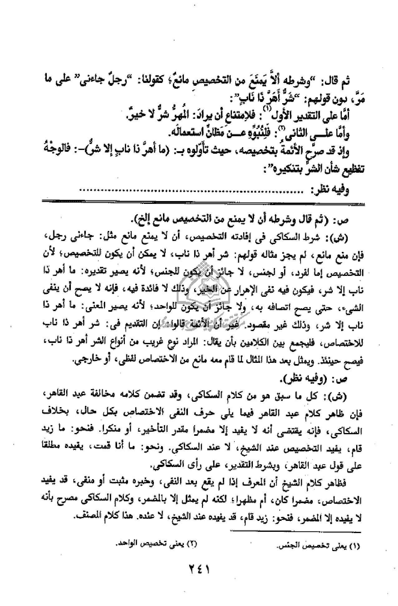 (ش): شرط السكاكى فى إفادته التخصيص، أن لا يمنع مانع مثل: جاءنى رجل، فإن منع مانع، لم يجز مثاله قولهم: شر أهر ذا ناب، لا يمكن أن يكون للتخصيص؛ لأن التخصيص إما لفرد، أو لجنس، لا جائز أن يكون للجنس؛ لأنه يصير تقديره: ما أهر ذا ناب إلا شر، فيكون فيه نفى الإهرار عن الخير، وذلك لا فائدة فيه، فإنه لا يصح أن ينفى
