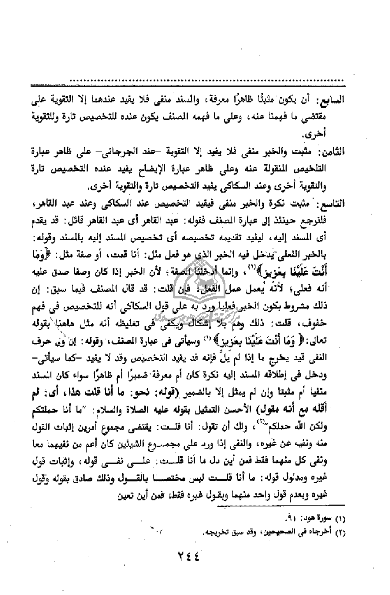 السابع: أن يكون مثبتا ظاهرا معرفة، والمسند منفى فلا يفيد عندهما إلا التقوية على مقتضى ما فهمنا عنه، وعلى ما فهمه المصنف يكون عنده للتخصيص تارة وللتقوية أخرى.
